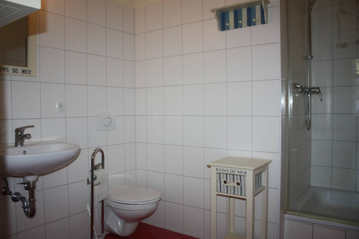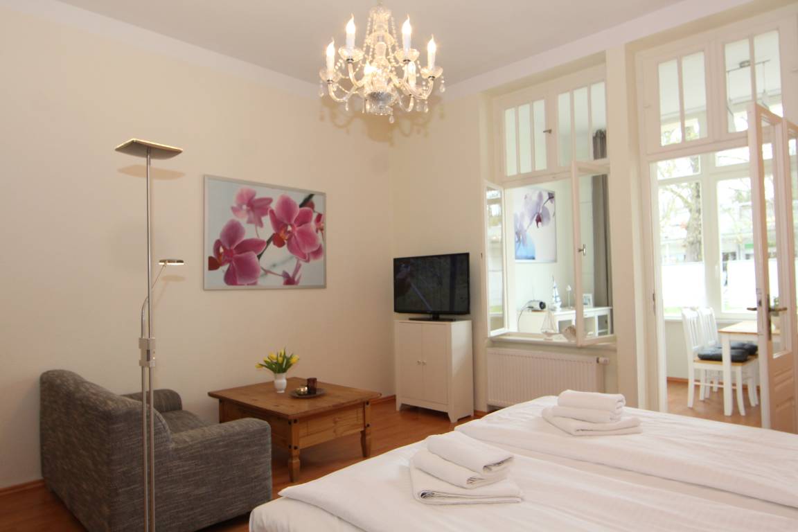 Dieses 40 qm große, helle 1-Zimmer-Appartement mit großer Loggia befindet sich im Erdgeschoss. Der großzügige Wohnraum beherbergt ein Boxspringbett mit getrennten Matratzen (90x200) und einen Kleiderschrank sowie eine kleine Sitzecke zum Entspannen und Fernsehen. In der geschlossenen Loggia (Fenster lassen sich öffnen), die zum Süden ausgerichtet ist, können an dem großen Esstisch die Mahlzeiten eingenommen werden. Die Pantryküche mit zwei Kochplatten, Kühlschrank, Mikrowelle und Geschirrspüler befindet sich separat im Flurbereich. Das Bad ist mit Dusche, Waschbecken und WC ausgestattet.