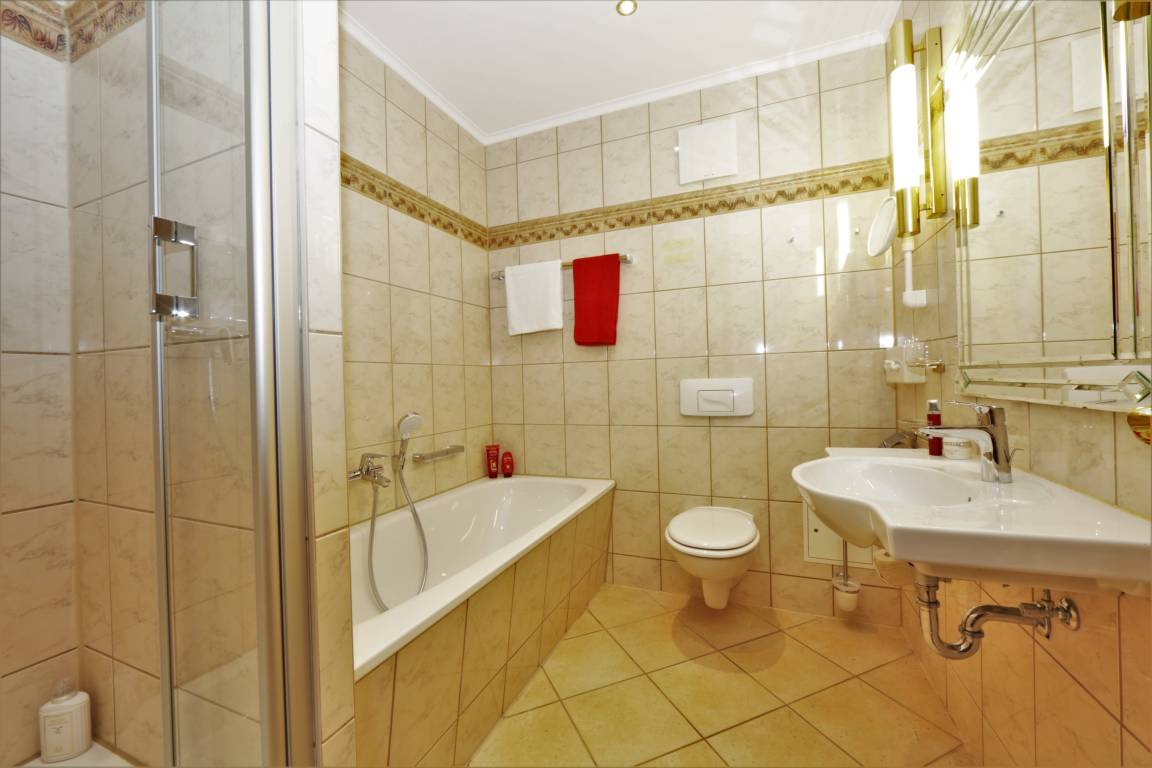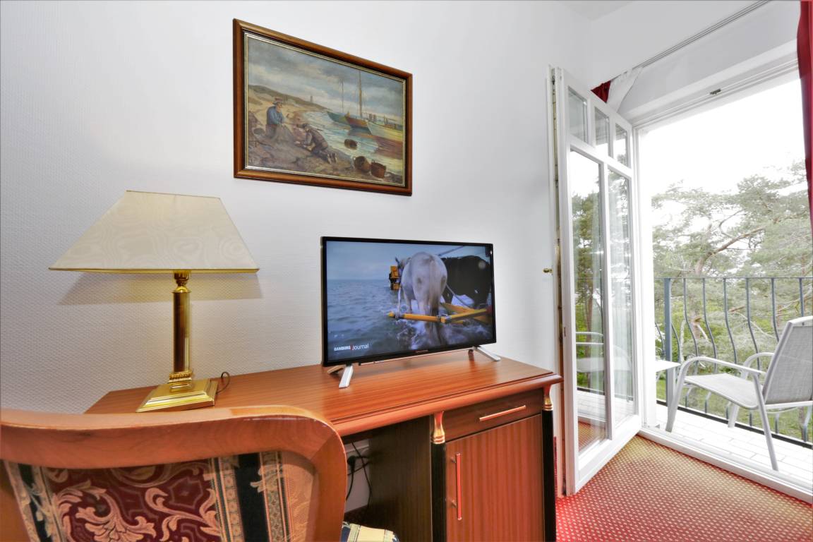 Diese 45 qm große 2-Zimmer Wohnung im italienischen Stil befindet sich im Dachgeschoss und bietet 2 Personen ausreichend Platz für einen erholsamen Urlaub am Meer. Das Wohnzimmer ist mit einer Couch, Sessel, Couchtisch und TV sowie einem kleineren Esstisch und drei Stühlen eingerichtet. Die moderne Küchenzeile, ausgestattet mit Cerankochfeld, Backkofen mit Mikrowellenfunktion, Kühlschrank mit Gefrierfach etc. ist offen im Wohnraum integriert. Das Schlafzimmer ist mit einem Boxspringbett mit getrennten Matratzen (90 x 200), einem Kleiderschrank und Kofferablage möbliert. Ein kleiner seeseitiger Balkon, von dem aus Sie teilweise das Meer sehen können, ist sowohl vom Wohn- als auch vom Schlafraum begehbar. Das gut ausgestattete Bad bietet den Gästen Badewanne, Echtglasdusche und Waschtisch/WC. Außerdem steht Ihnen ein separates Gäste-WC zur Verfügung. Der Pkw-Stellplatz befindet sich unmittelbar vor dem Haus und ist der Wohnung zugeordnet.