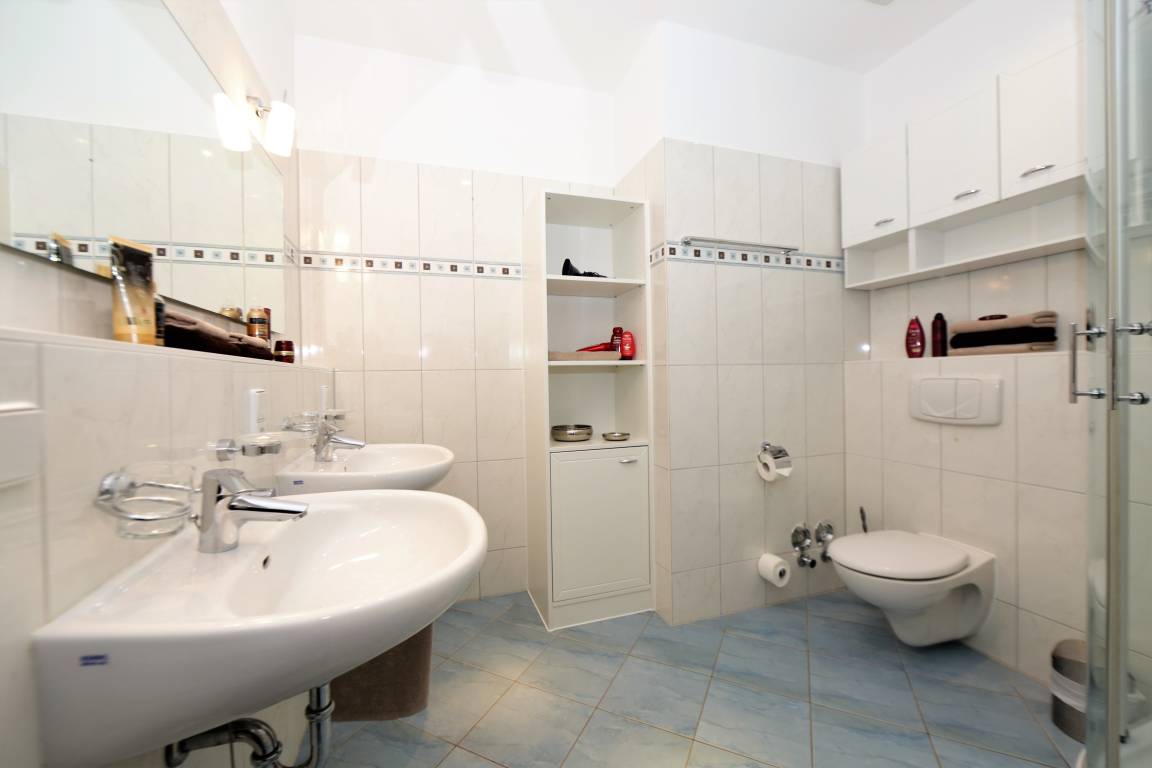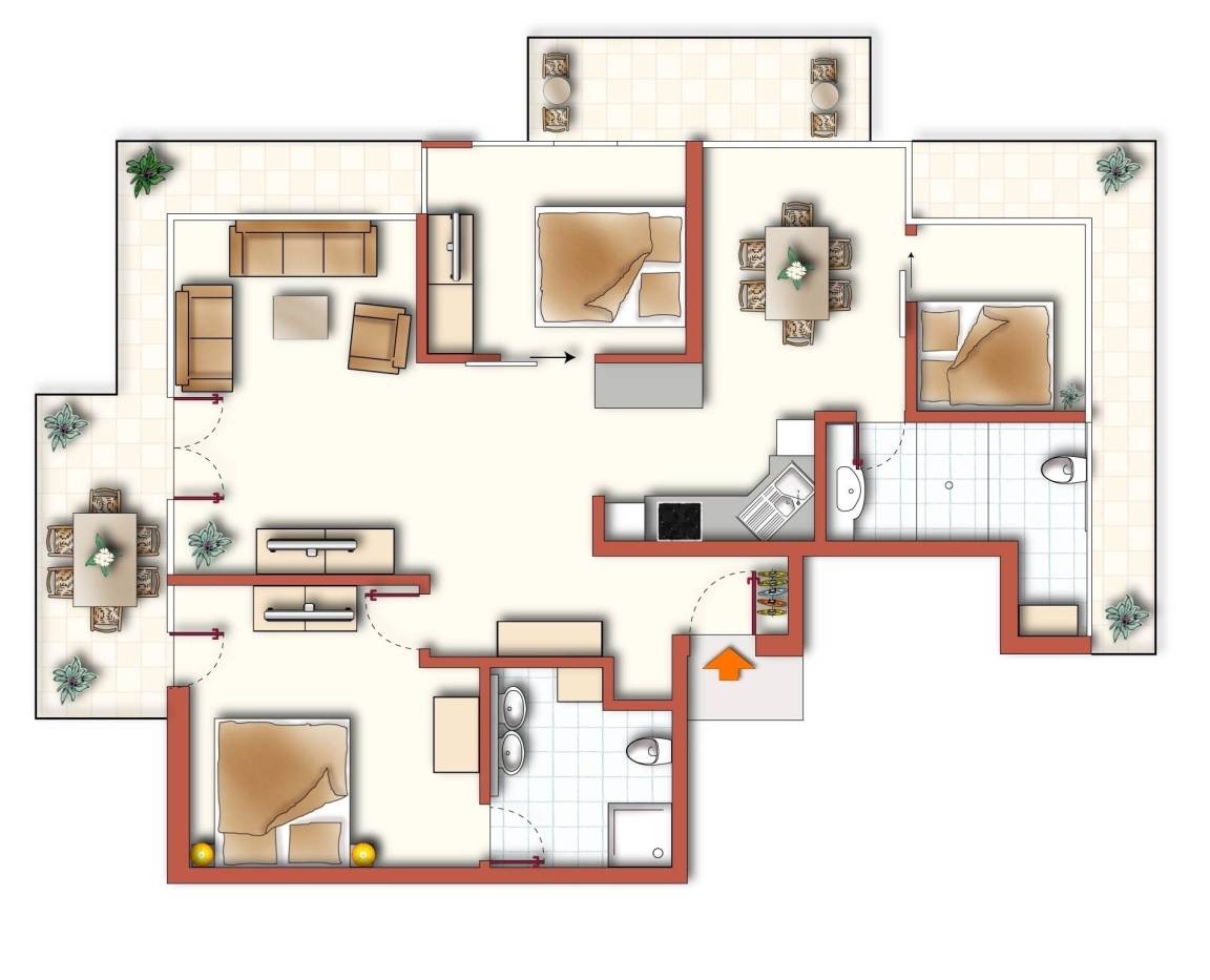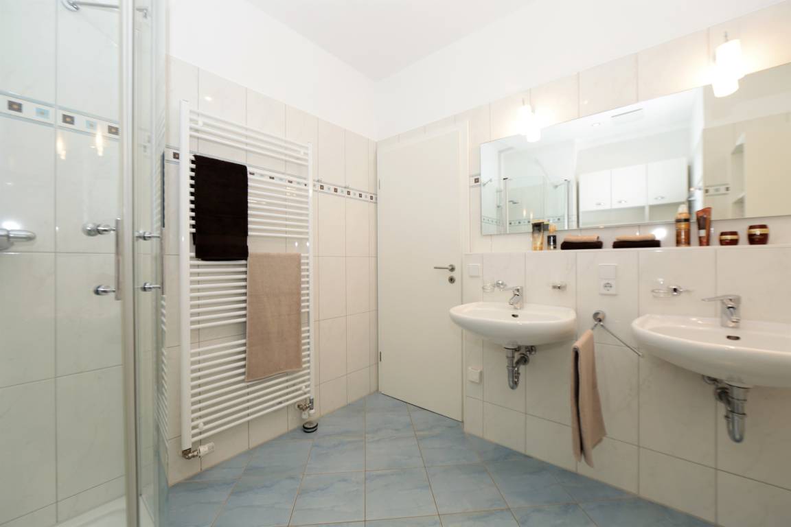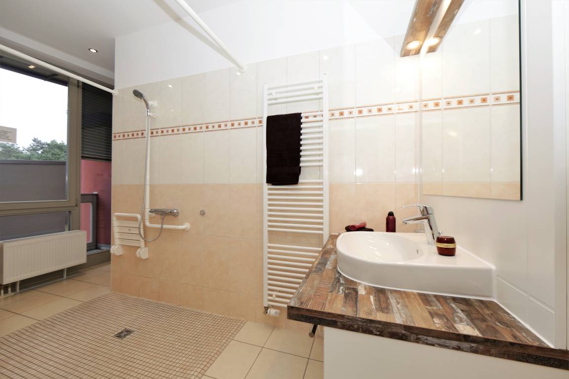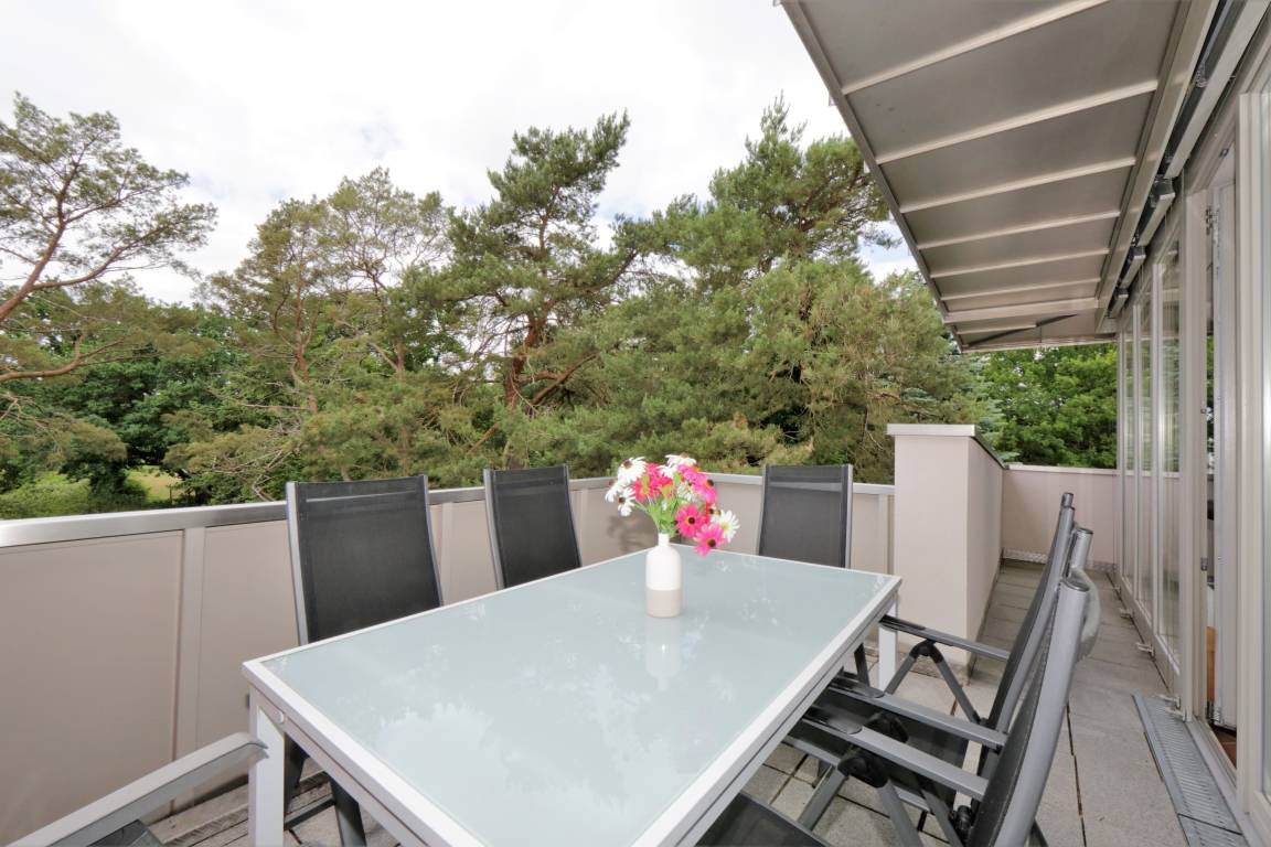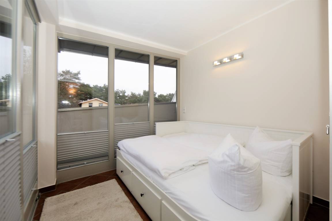 Diese 107 qm große 4-Zimmer Wohnung im 2. Obergeschoss erreichen Sie aus dem Keller über den Aufzug. Auf den drei Balkonen können Sie zu fast jeder Tageszeit die Sonne genießen. Der großzügige Wohnbereich mit seinen großen Glasfronten verfügt über eine gemütliche Sitzecke mit großem Flat-TV und Musikanlage. Von hier aus ist auch der größere Balkon zu betreten, der mit einem großen Tisch und Stühlen möbliert ist und zu gemeinsamen Mahlzeiten im Freien einlädt. Der angrenzende Essbereich mit einer modernen Vollküche incl. Spülmaschine, Ceranfeld, Kühlschrank, Mikrowelle etc. und einem Essplatz für 6 Personen ist ebenfalls offen im Wohnraum integriert. Vom Essplatz können Sie den angrenzenden Südbalkon betreten. Das große Schlafzimmer mit einem Bad en suite ist mit einem Doppelbett mit getrennten Matratzen (90 x 200) und genügend Schrankraum ausgestattet. Hier Steht Ihnen ein zweiter großer Flat TV zur Unterhaltung zur Verfügung und auch ein zusätzliches Kinderreisebett würde hier Platz finden. Das großzügige Bad verfügt über Dusche und Doppelwaschbecken/WC. Ein weiteres Schlafzimmer ist ebenfalls mit einem Doppelbett mit getrennten Matratzen (90x200), Stauraum und einem zusätzlichen TV eingerichtet. Von hier aus gelangt man ebenfalls auf den Südbalkon, der den Gästen ein wenig Zurückgezogenheit bietet. Das kleine Schlafzimmer ist mit einem Tandembett (jeweils 80x200) ausgestattet, dass je nach Bedarf bis zu 2 Personen einen Schlafplatz stellt. Das andere Bad ist mit einer großen ebenerdigen Dusche und Waschtisch/WC ausgestattet. Im Keller finden Sie eine Sauna, die den Gästen im Winterhalbjahr zur kostenfreien Nutzung zur Verfügung steht, ebenso einen Fahrradraum, Waschmaschine und Trockner.