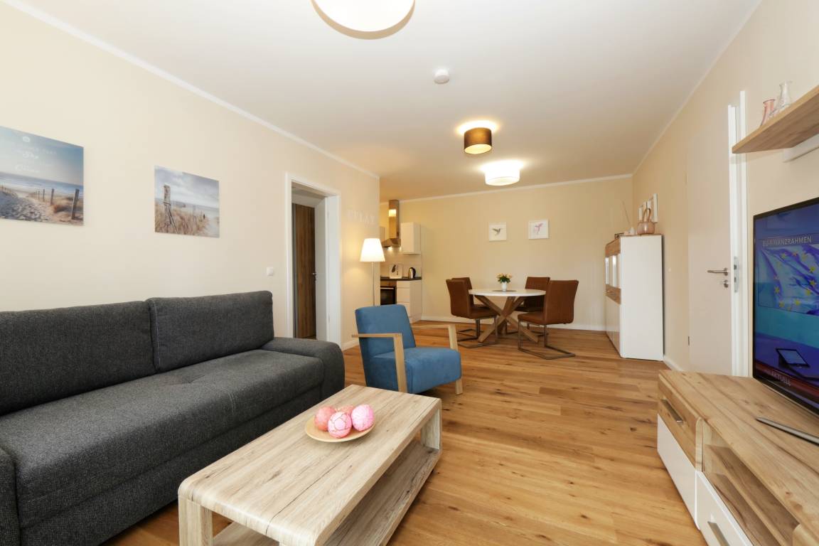 Dieses hochwertige und moderne 2-Zimmer Appartement ist 67 qm groß und befindet sich im 1. Obergeschoß des 2017 neu erbauten Haus Maxim. Die Wohnung ist für 2-4 Personen geeignet. Im hell eingerichteten Wohnbereich erwartet Sie eine behagliche Polstergarnitur mit Schlaffunktion zum Relaxen, ein moderner Couchtisch sowie ein Esstisch und einem Flat- TV mit integriertem Radio. Die im Wohnraum integrierte Küchenzeile ist mit Cerankochfeld, Backofen, Geschirrspülmaschine und Kühlschrank mit Gefrierfach ausgestattet. Das helle Schlafzimmer verfügt über ein komfortables Doppelbett mit getrennten Matratzen (0,90x2,00m) und einen Kleiderschrank. Das moderne Tageslichtbadezimmer ist mit einer ebenerdigen Dusche, einem Waschtisch, WC und Haartrockner ausgestattet. Über den Wohnbereich erreichen Sie den nach nord-osten ausgerichteten Balkon mit Blick auf den Ort.