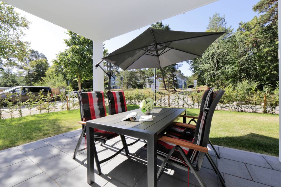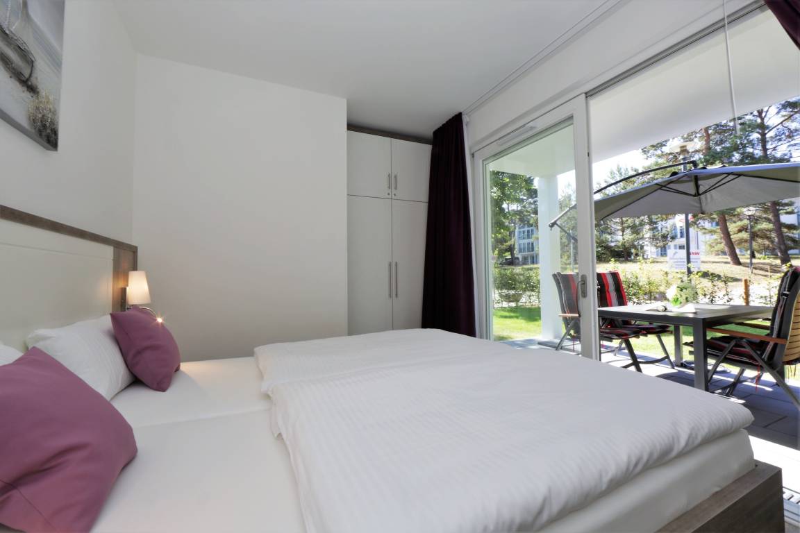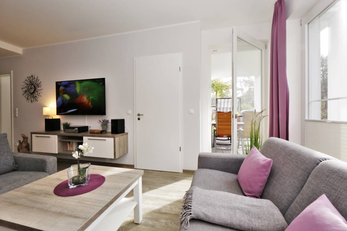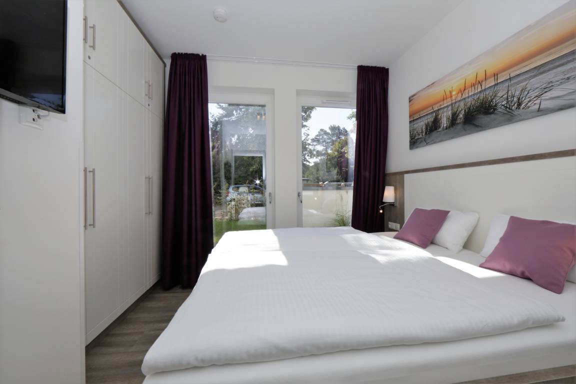 Dieses hochwertig und geschmackvoll eingerichtete 3-Zimmer Appartement ist 60 qm groß und befindet sich im Erdgeschoss der 2018 neu erbauten Strandresidenz. Die Wohnung mit 2 Schlafzimmern bietet 4 Personen reichlich Komfort im Urlaub. Im Wohnbereich mit großer Fensterfront erwartet Sie eine bequeme Polstergarnitur mit zwei Sofas und einem Sessel, ein Couchtisch und Flat TV sowie ein Esstisch für gemeinsame Mahlzeiten. Die moderne Küche mit Cerankochfeld, Backofen, Mikrowelle, Geschirrspüler, Kühlschrank etc. ist ebenfalls offen im Wohnraum integriert. Beide Schlafzimmer verfügen jeweils über ein komfortables Doppelbett mit getrennten Matratzen (90 x 200) und reichlich Schrankraum. Eines der Schlafzimmer bietet Ihnen einen zusätzlichen TV. Über den Wohnbereich sowie eines der Schlafzimmer erreichen Sie die große zum Süden ausgerichtete überdachte möblierte Terrasse, die viele erholsame Sonnenstunden und Mahlzeiten im Freien verspricht. Der Strandkorb beschert Ihnen ein wenig Abgeschiedenheit. Das Badezimmer mit Fenster ist mit einer bodengleichen Dusche mit Echtglasabtrennung und Waschtisch/WC ausgestattet.