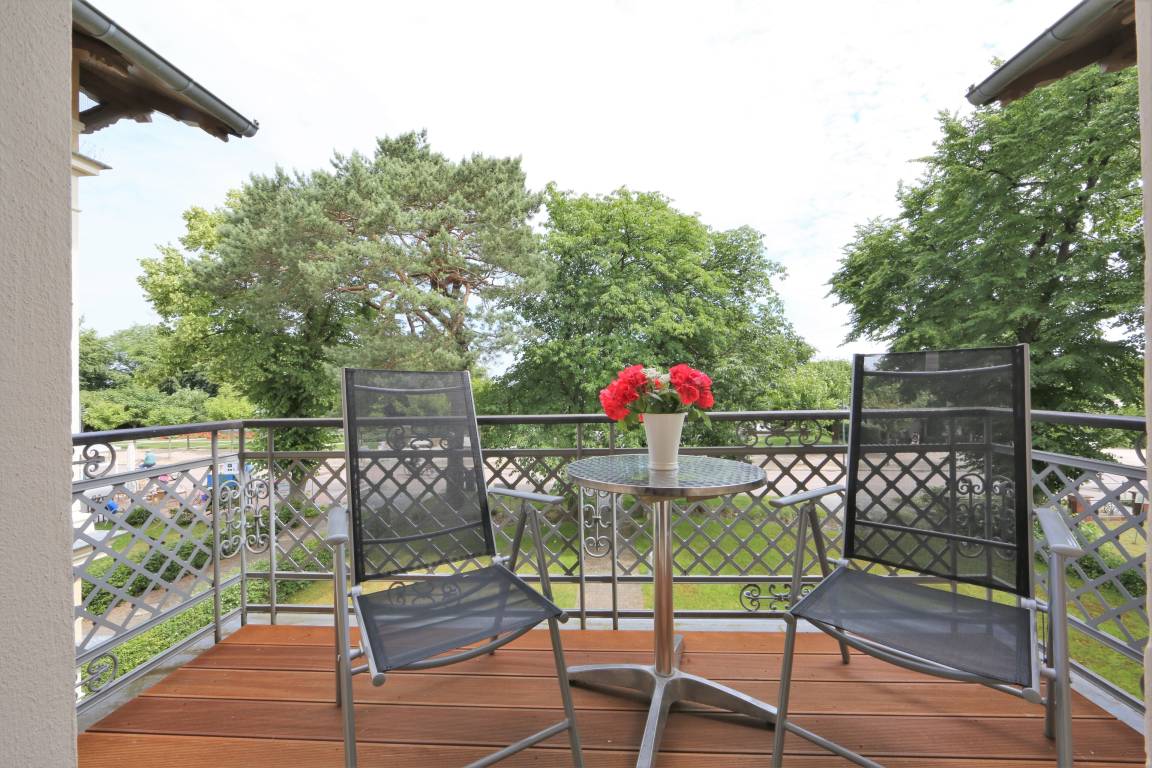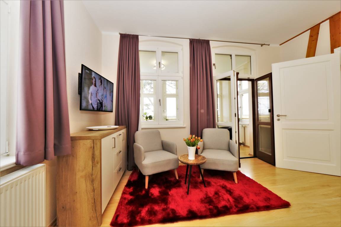Dieses 46 qm große 1 Zimmer Appartement im 1. Obergeschoss eignet sich für 2 Personen plus Kind. Der kombinierte Wohn-/Schlafraum ist mit einem Doppelbett mit getrennten Matratzen (90 x 200), einem Kleiderschrank und zwei Sesseln möbliert. Flat TV und Musikanlage sind selbstverständlich. Die mit einem Sofa mit Schlaffunktion (Matratze 140 x 200) und zwei weiteren Sesseln eingerichtete angrenzende Loggia bietet den Gästen einen uneingeschränkten Blick auf die Ostsee und die Promenade. Die separate helle Küche ist mit einer Einbauküche mit Geschirrspüler, Cerankochfeld mit Backofen, Kühlschrank etc. und einem Essplatz ausgestattet. Von hier aus können Sie den Balkon betreten. Mit seiner nordöstlichen Ausrichtung genießen Sie hier denselben schönen Blick wie aus der Loggia. Das Badezimmer bietet den Gästen Waschtisch/WC sowie Dusche. Ein Pkw-Stellplatz befindet sich auf dem Grundstück und ist der Wohnung zugeordnet.