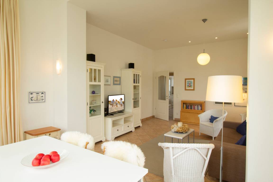 Dieses mit 78 qm großzügige 2 Zimmer Appartement im 1. Obergeschoss bietet 2–4 Personen ausreichend Platz für einen entspannten Urlaub. Der helle großzügige Wohnraum ist mit einer Couch mit Schlaffunktion (Liegefläche 140x200) und Rattansesseln sowie Flat TV und Musikanlage ausgestattet. Die zum Wohnbereich offene Loggia in westlicher Ausrichtung bietet den Gästen einen Essplatz für 4 Personen. Von hier aus können Sie einen Blick auf die Ostsee erhaschen. Die separate Küche ist mit einer Einbauküche mit Geschirrspüler, Cerankochfeld mit Backofen, Mikrowelle etc. und einem kleineren Sitzplatz für 2 Personen ausgestattet. Von der Küche erreichen Sie auch den Balkon in südöstlicher Ausrichtung. Das auf zwei Seiten mit Fenstern ausgestattete Schlafzimmer ist mit einem Doppelbett mit getrennten Matratzen (90 x 200) und reichlich Schrankraum eingerichtet. Das große Badezimmer ebenfalls mit Fenster bietet den Gästen Waschbecken/WC und eine Dusche. Ein Pkw-Stellplatz befindet sich auf dem Grundstück und ist der Wohnung zugeordnet. Waschmaschine und Trockner sind im Keller gegen Gebühr nutzbar. Eine Unterstellmöglichkeit für Fahrräder befindet sich im Keller.