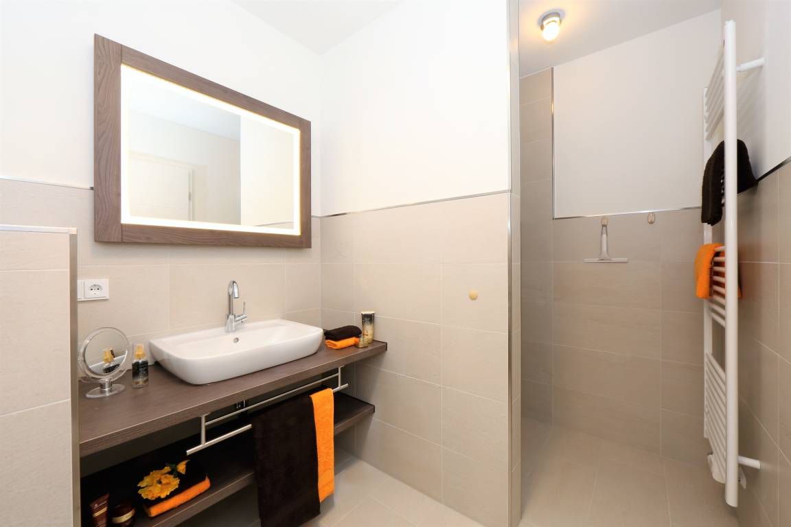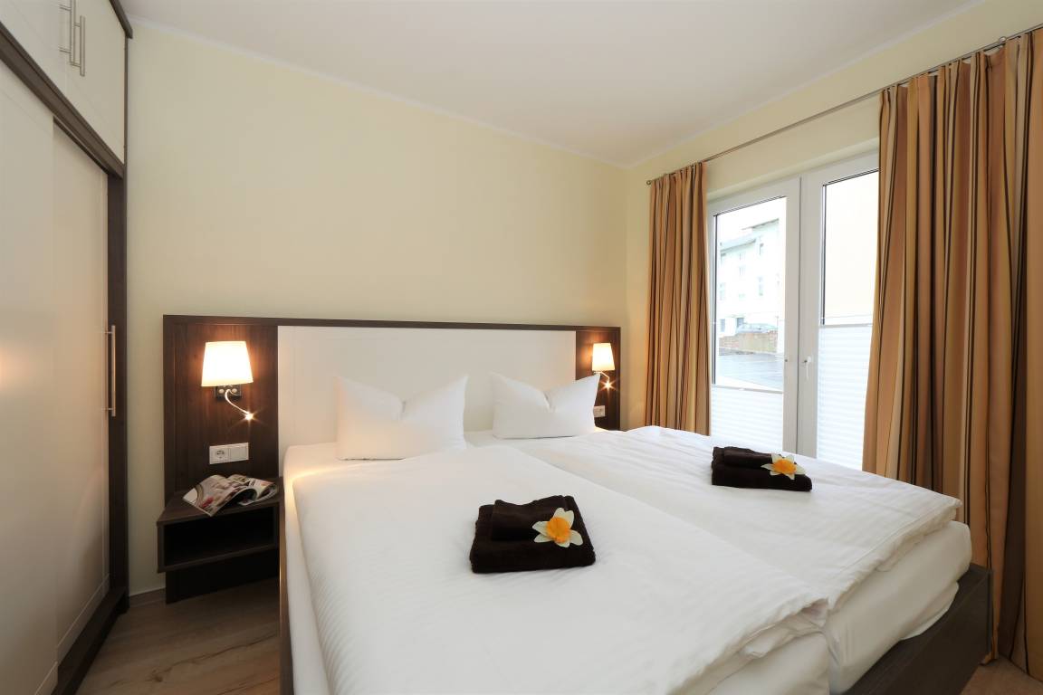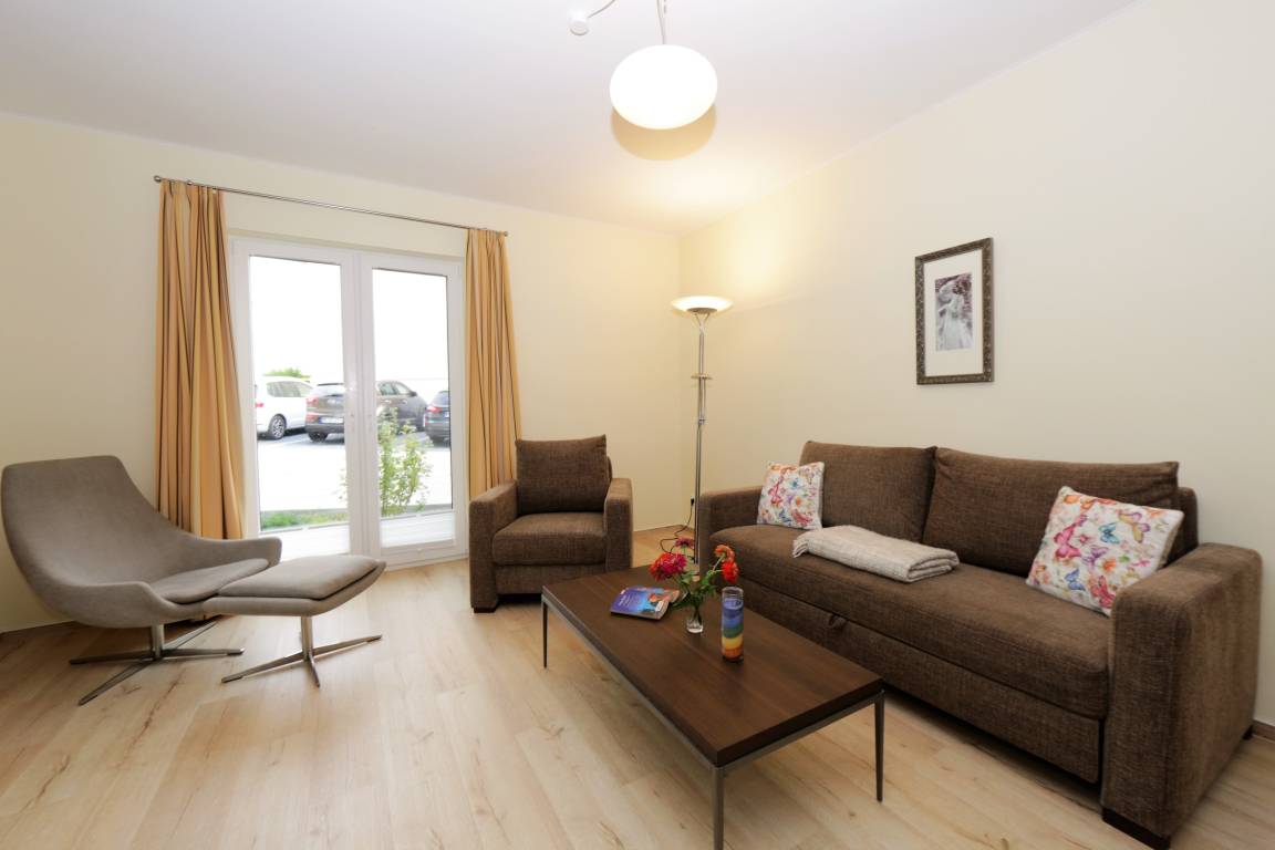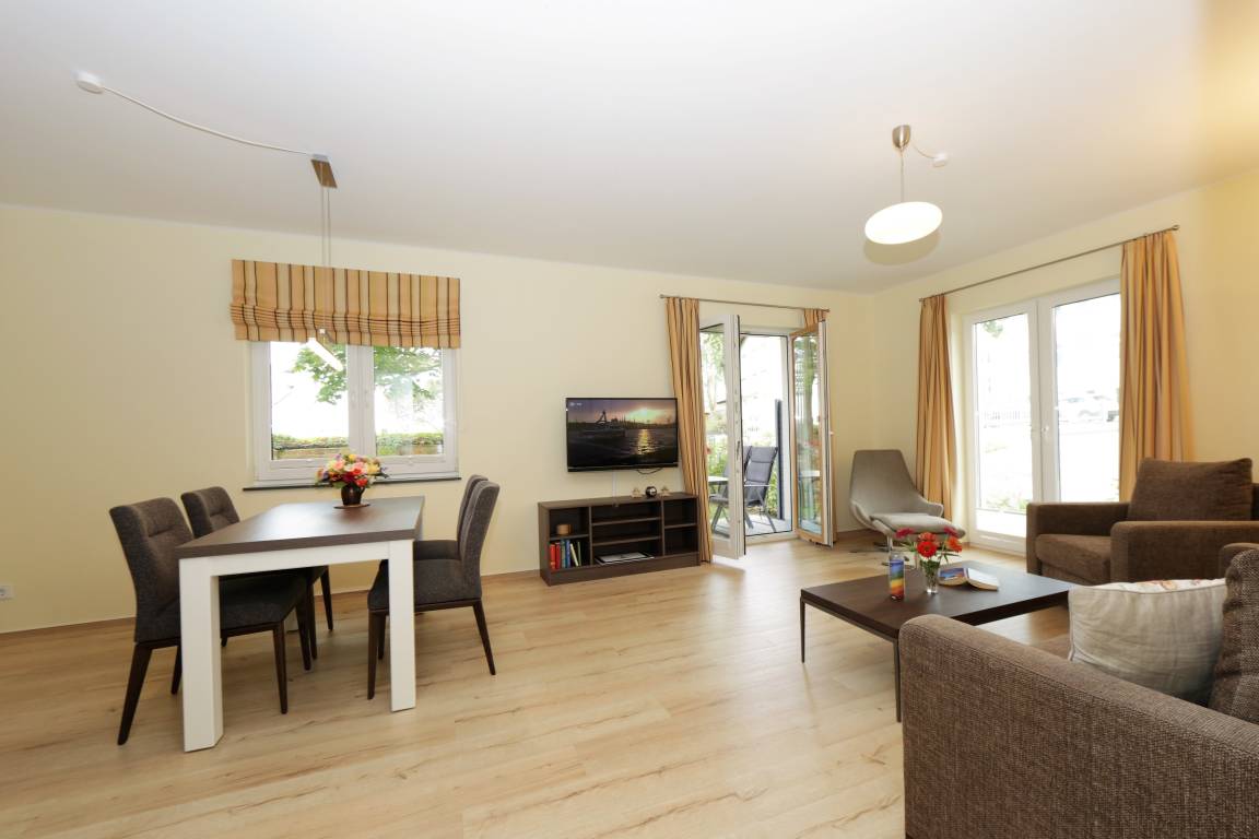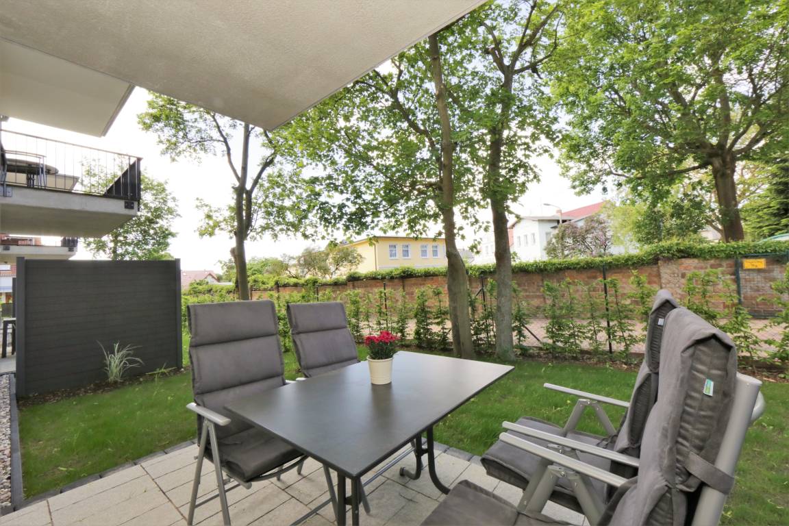 Dieses hochwertige und moderne 3-Zimmer Appartement ist 76 qm groß und befindet sich im Erdgeschoss der 2016 neu erbauten Ahlbeck Suiten. Die Wohnung ist für 4-6 Personen geeignet. Im hell eingerichteten Wohnbereich erwartet Sie eine behagliche Polstergarnitur mit Schlaffunktion (Liegefläche 160 x 200) zum Relaxen, ein moderner Couchtisch sowie ein Esstisch und ein Flat- TV mit integriertem Radio. Die im Wohnraum integrierte Küchenzeile ist mit Cerankochfeld, Backofen, Geschirrspülmaschine und Kühlschrank ausgestattet. Die hellen Schlafzimmer verfügen jeweils über ein komfortables Doppelbett mit getrennten Matratzen (90 x 200) und einen großzügigen Kleiderschrank. Das moderne Badezimmer ist mit einer ebenerdigen Dusche, einem großen Waschtisch, WC sowie einer Waschmaschine ausgestattet. Für eine behagliche Wärme an kälteren Tagen sorgt in der kompletten Wohnung die Fußbodenheizung. Über den Wohnbereich erreichen Sie die nach Westen ausgerichtete überdachte Terrasse.