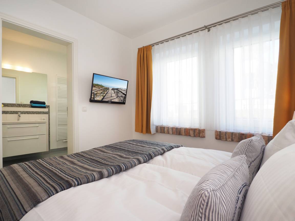 Ebenfalls im Erdgeschoss befindet sich ein Schlafzimmer mit Bad en suite. Das Boxspringbett mit getrennten Matratzen (160 bzw. 180 x 200) sowie die Möglichkeit der Verdunklung sorgen für erholsamen Schlaf. Ausreichend Schrankraum ist vorhanden. Das großzügige Bad mit Fenster bietet Ihnen sowohl Badewanne als auch Dusche und Waschtisch/WC.
