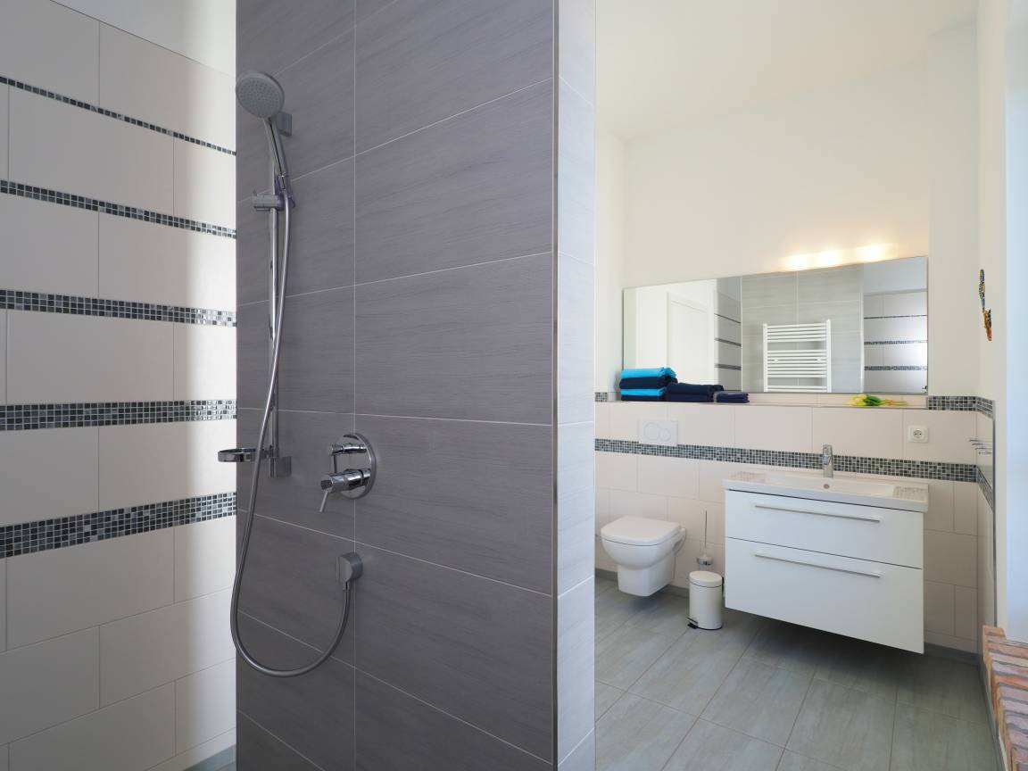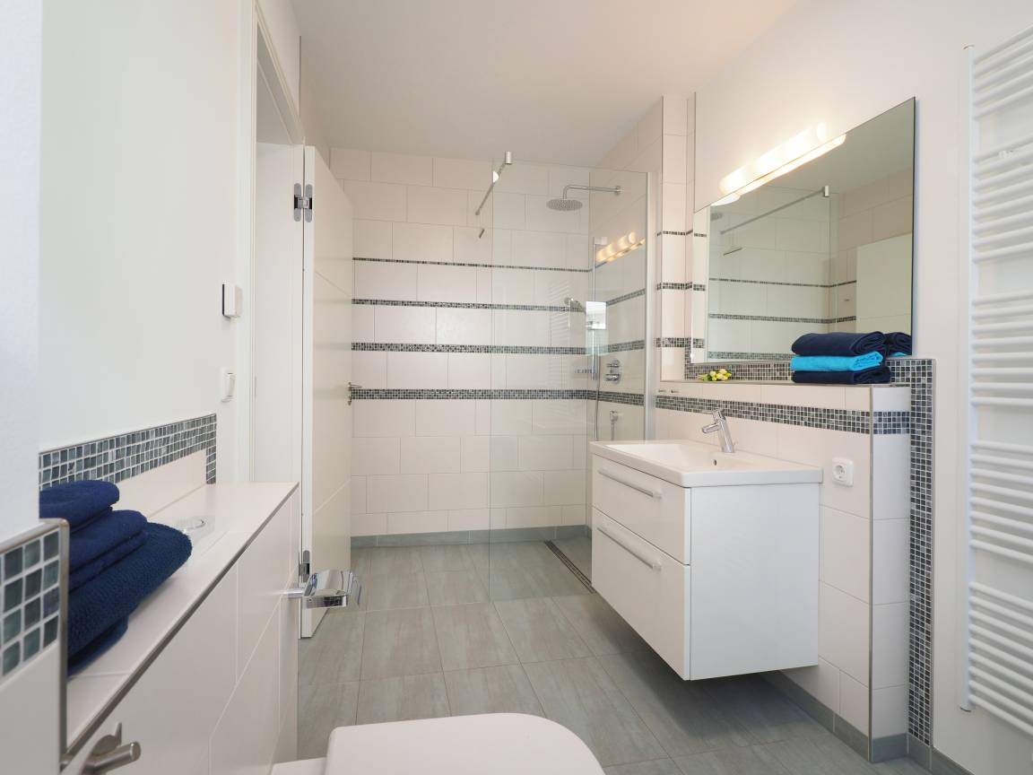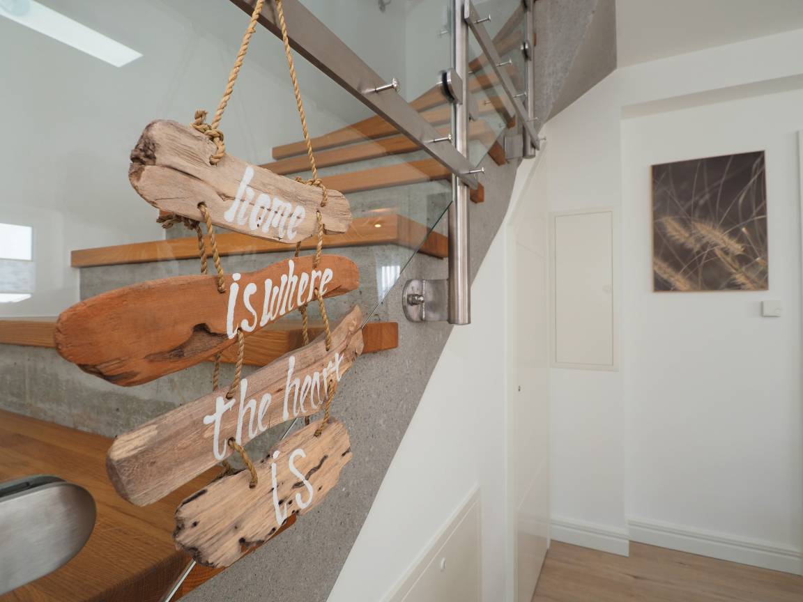 Diese moderne hochwertige 4-Zimmer Haushälfte erstreckt sich mit ihren 98 qm und ihren 4 Zimmern über zwei Ebenen. Alle Räume sind geschmackvoll und mit viel Liebe zum Detail gestaltet. Maximal 6 Personen können hier mit viel Komfort erholsame Ferien verleben. Im Erdgeschoss lädt die Wohnküche zum Kochen und zu gemeinsamen Mahlzeiten ein. Die moderne Küche ist mit Geschirrspüler, Cerankochfeld, Backofen, Kühlschrank etc. ausgestattet. Am angrenzenden bequemen Essplatz werden Sie gerne länger verweilen. Über ein paar Stufen abwärts erreichen Sie den offenen Wohnraum mit Sofa, Couchtisch und Flat TV. Von hier aus gelangen Sie auf die möblierte Terrasse, die südlich ausgerichtet ist und viel Sonne verspricht.