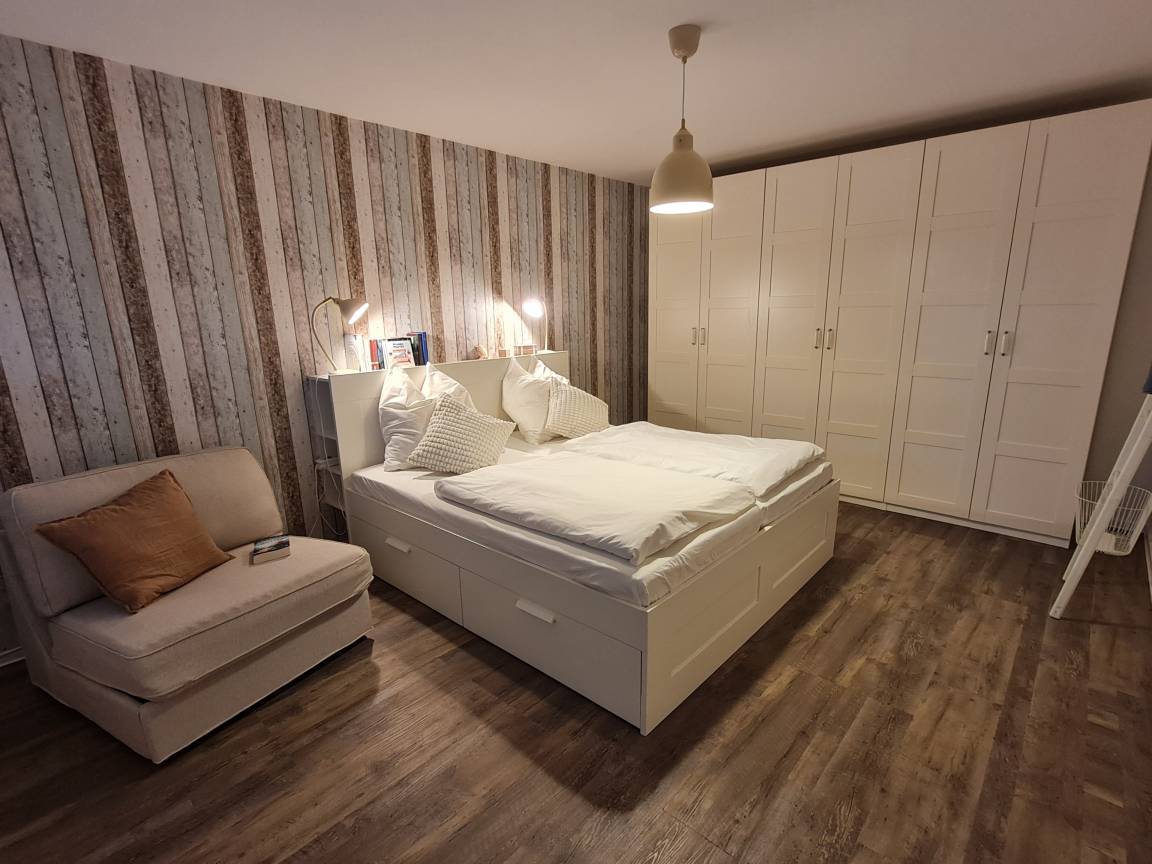 Im großzügigen Schlafzimmer befindet sich neben dem Doppelbett noch eine gemütliche Leseecke für eine Person um sich mit einem Roman zurückzuziehen! In dem großen Kleiderschrank finden Sie für alle Sachen der ganzen Familie Platz. Im kleinen Nebenraum kann man es sich im Etagenbett von Jung bis Alt gemütlich machen! Weitere Kommoden runden das Platzangebot ab.