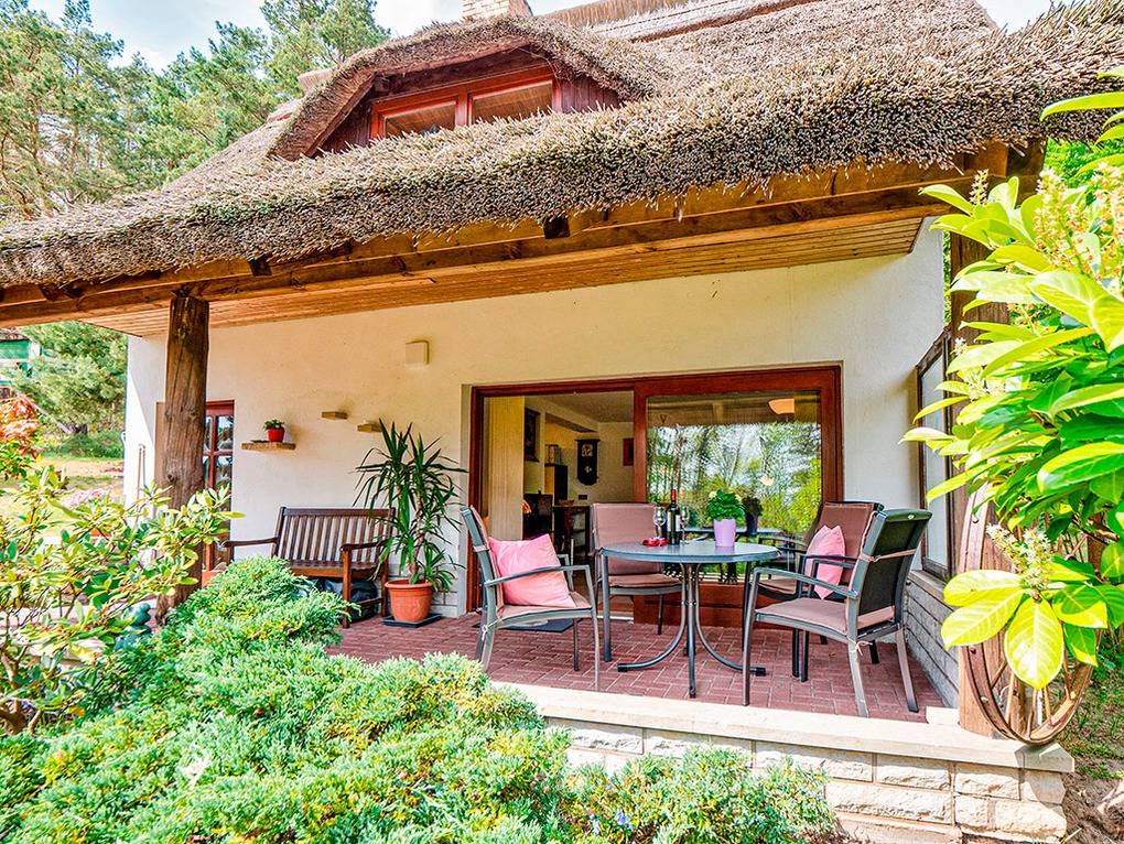 Haus: Landschaftstypisches, reetgedecktes Ferienhaus mit freundlicher Einrichtung. Schöne Sonnenterrasse mit Sitzmöbeln. Fußbodenheizung.