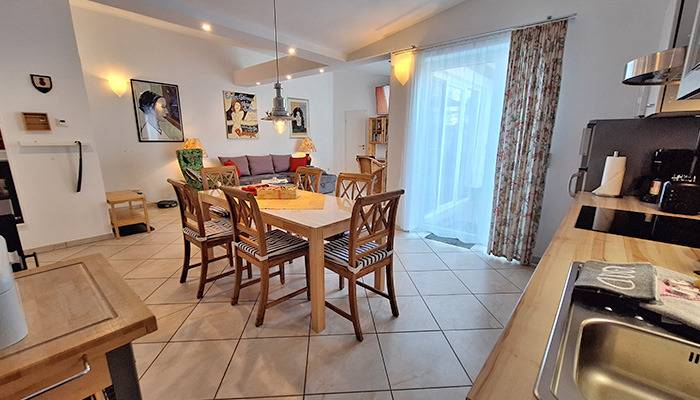 - vollwertige Küche mit Filterkaffeemaschine 4x4, Backofen, Mikrowelle, Kochfeld, Gefrierkombination, Geschirrspüler sowie Esstisch