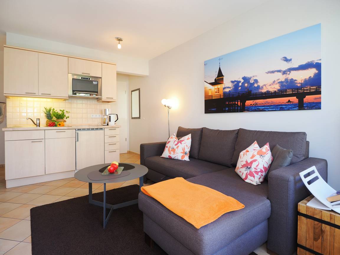 Dieses 37 qm große 2 Zimmer Appartement befindet sich im Hochparterre und ist für 2 Personen und max. ein Kind geeignet. Der geschmackvoll eingerichtete Wohnraum ist mit seiner breiten Fensterfront vom Licht verwöhnt und bietet den Gästen eine gemütliche Eckcouch mit Schlaffunktion (Liegefläche 140 x 185) zum Entspannen. Flat-TV und Radio sind selbstverständlich. Der Essplatz sowie die Küchenzeile incl. Geschirrspüler, Kühlschrank, Mikrowelle, Cerankochfeld etc. befinden sich ebenfalls im Wohnraum. Den Balkon in westlicher Ausrichtung können die Gäste vom Wohnraum begehen. Das Schlafzimmer ist mit einem Doppelbett mit getrennten Matratzen (80 x 200) und reichlich Schrankraum eingerichtet. Im modernen hochwertigen Bad steht den Gästen eine Dusche sowie Waschtisch/WC zur Verfügung. Im Keller finden Sie eine Sauna, einen Fahrradraum, Waschmaschine und Trockner. Der Pkw-Stellplatz befindet sich auf dem abgeschlossenen Grundstück und ist der Wohnung zugeordnet.