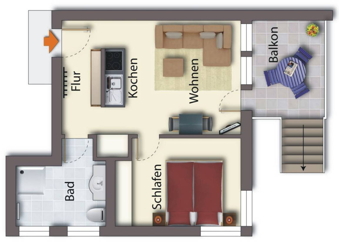 37 m² Ferienwohnung ∙ 1 Schlafzimmer ∙ 2 Gäste