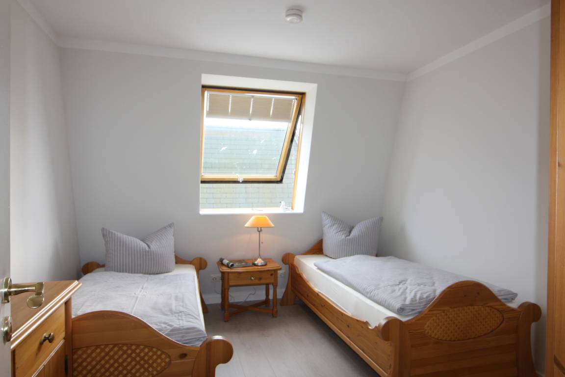 Dieses 55 qm große 3-Zimmer Appartement befindet sich im Dachgeschoss eines der beiden Neubauten und ist über einen Fahrstuhl zu erreichen. Das Highlight dieser Wohnung ist der traumhafte Blick über den Schloonsee vom Schlaf- und Wohnzimmer sowie vom Balkon. Der Wohnbereich ist mit einer gemütlichen Couch, Sessel, Couchtisch und TV/Radio eingerichtet. Die moderne Küchenzeile, ausgestattet mit Ceranfeld, Backofen, Mikrowelle, Kühlschrank, Geschirrspüler und ein Essplatz für 4 Personen sind offen im Wohnbereich integriert. Das große Schlafzimmer ist mit einem Doppelbett mit getrennten Matratzen (90x200) und reichlich Schrankraum eingerichtet. Von diesem Schlafzimmer und vom Wohnzimmer ist der zum Süden gerichtete Balkon begehbar, der fast den ganzen Tag viel Sonne verspricht. Das zweite Schlafzimmer ist mit zwei Einzelbetten (90x200) und einem Kleiderschrank eingerichtet. Aus dem geöffneten Dachfenster können Sie zwischen den Häusern das Meer erblicken. Das innenliegende Bad ist mit Dusche und Waschbecken/WC ausgestattet. Ein Pkw-Stellplatz im Doppelparker (max. 1,50 m Autohöhe, max Autolänge 5,00 m; keine Kombis) befindet sich in der Tiefgarage unter dem anderen Neubau auf demselben Grundstück. Eine Sauna und ein Waschmaschinenraum gehören zur Anlage und stehen den Gästen zur Nutzung zur Verfügung.