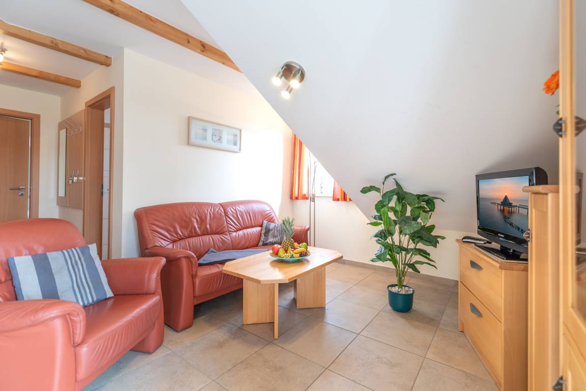 Im rechten Dachgeschoss der Bernstein-Villa erwartet Sie eine geschmackvoll eingerichtete 2-Zimmer-Wohnung – der ideale Rückzugsort für einen erholsamen Usedom-Urlaub.