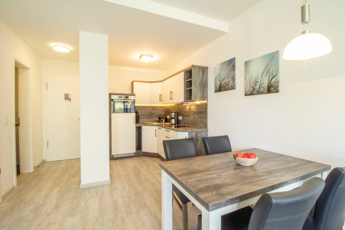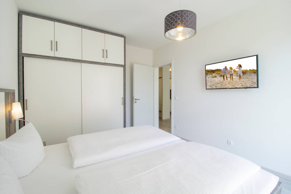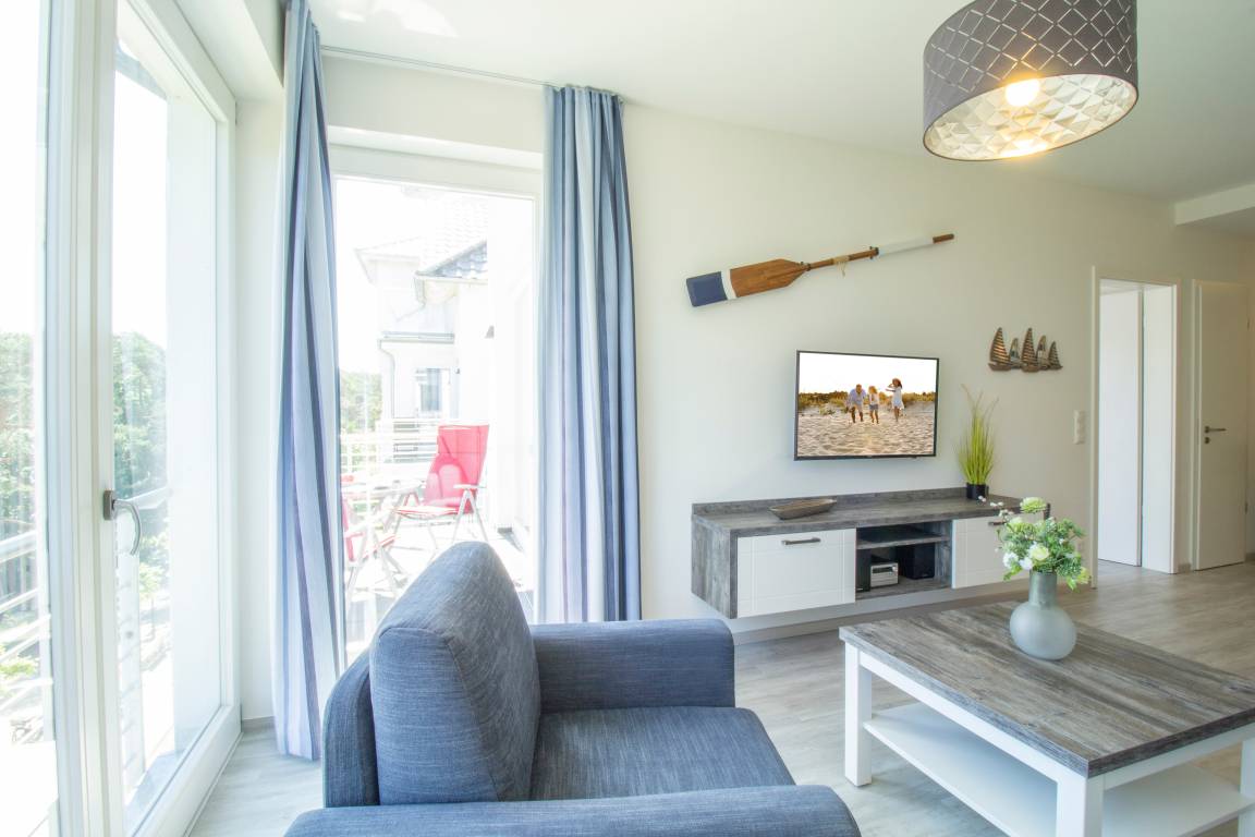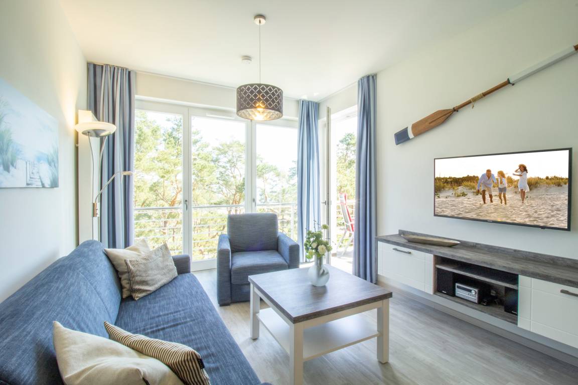 Diese moderne 2-Zimmer Wohnung mit 52 m² Wohnfläche befindet sich im 3. Obergeschoss der 2018 neu erbauten Strandresidenz. Der Balkon in Richtung Promenade lockt die Gäste schon zum Frühstück ins Freie. Von hier haben Sie schon zum Frühstück alles im Blick und genießen den Ausguck auf die Ostsee. Die Wohnung ist individuell und komfortabel ausgestattet und bietet 2-4 Personen Platz für einen erholsamen Urlaub am Meer. Der offene Wohnraum bietet Ihnen eine gemütliche Sitzecke mit einem bequemen Sofa mit Schlaffunktion (Matratze 160 x 200), Sessel und Flat TV. Die Küchenzeile incl. Backofen, Ceranfeld, Kühlschrank, Geschirrspüler, Mikrowelle etc. sowie der Essplatz sind ebenfalls offen im Wohnraum integriert. Das geräumige Schlafzimmer ist mit einem Doppelbett mit getrennten Matratzen (90 x 200), einem großen Kleiderschrank und zusätzlichem Flat TV eingerichtet. Der Balkon lässt sich sowohl vom Wohn- als auch vom Schlafzimmer betreten. Das großzügige, moderne Bad ist mit einer ebenerdigen Dusche mit Echtglasabtrennung und Waschtisch/WC ausgestattet.
