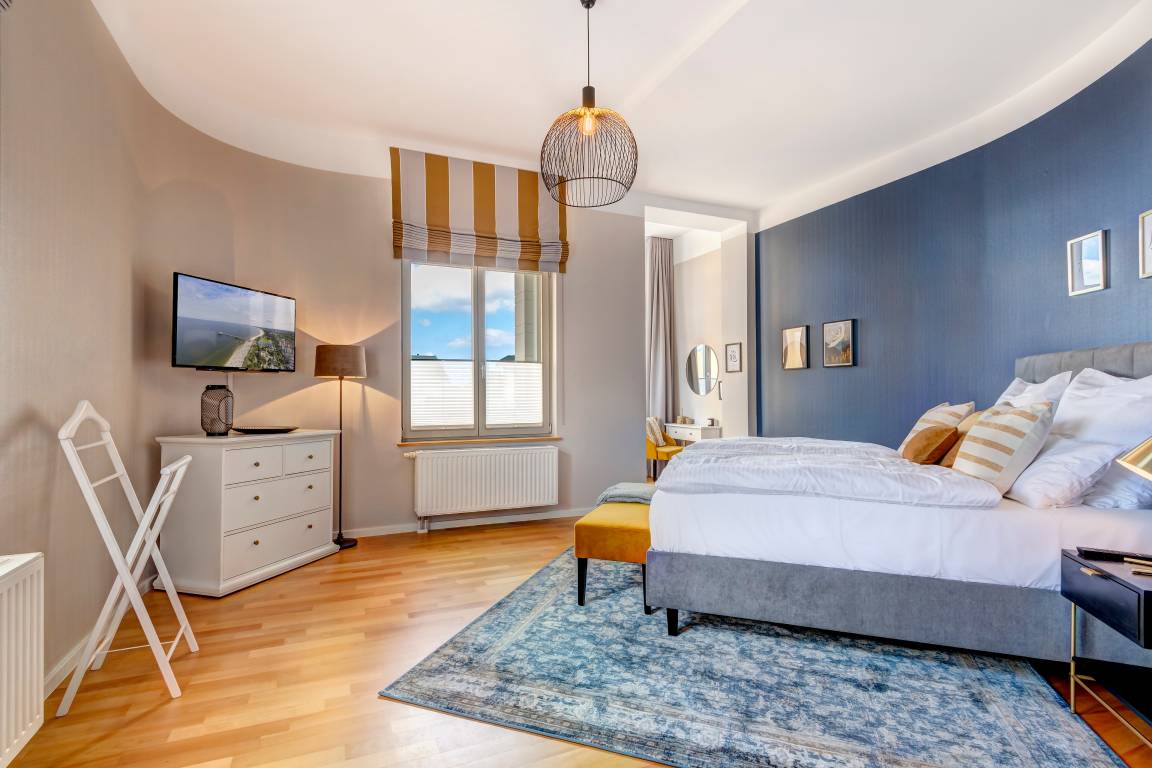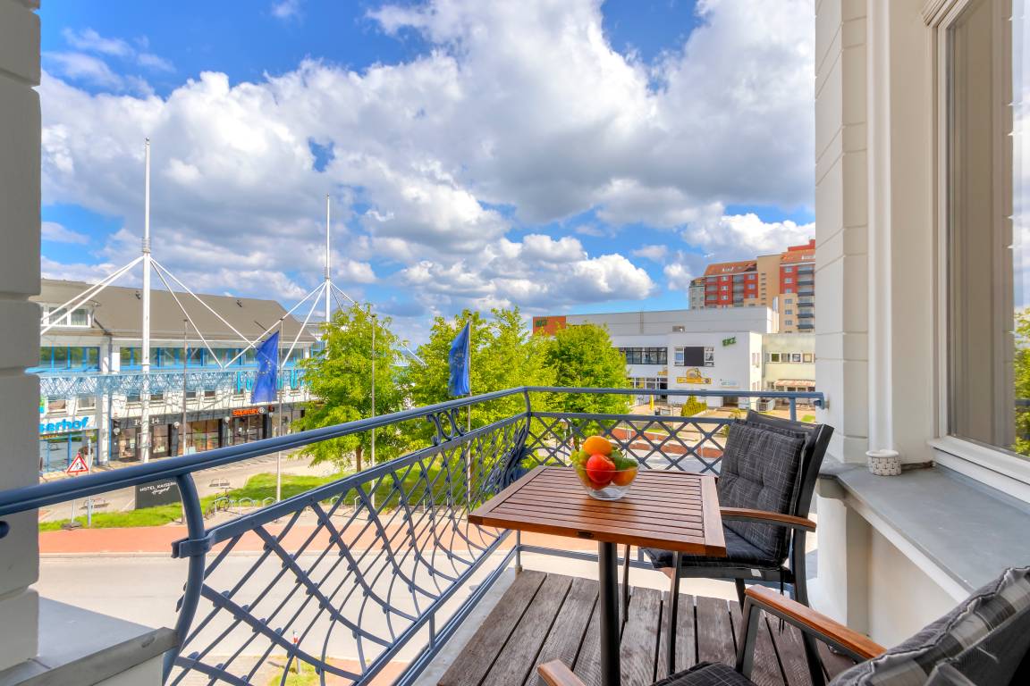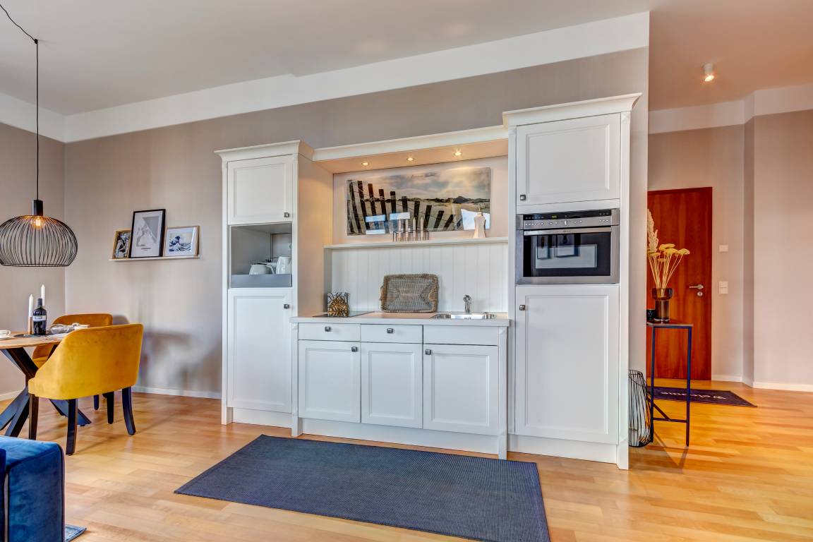 Die mit 79 qm großzügige 2-Zimmer Wohnung im 1. Obergeschoss besticht in jeder Hinsicht durch die tolle Lage und die komfortable Ausstattung. Die der ursprünglichen Architektur entsprechenden Ausstattung der Appartements ist elegant und anspruchsvoll und lässt den Alltag schnell verfliegen. Hochwertige moderne Möbel, gepaart mit Komfort, prägen das Wohn- und Wohlgefühl. Der stilvolle Wohnbereich ist mit einer gemütlichen Sitzecke (mit Schlaffunktion für eine dritte Person) eingerichtet. Die hohen Fenster spenden viel Licht. Der kleine Erker ist ein lauschiges Plätzchen zum Lesen oder Träumen. Hier sitzen Sie in der ersten Reihe, um das Treiben rund um die Konzertmuschel zu beobachten. Ein Flat TV sowie eine Stereoanlage incl. IPod Docking Station sorgen für Unterhaltungsgenuss. Eine kleine Küchenzeile mit Geschirrspüler, Backkofen/Mikrowelle, Kühlschrank und halbem Cerankochfeld sowie ein Essplatz sind ebenfalls offen im Wohnbereich integriert. Im geräumigen Schlafzimmer befinden sich ein Doppelbett mit getrennten Matratzen (90x200, Topper durchgehend) sowie Schrankraum für Ihre Kleidung und Gepäck. Am Sekretär im kleinen Erker schreiben Sie Ihre Urlaubsgrüße. Im modernen, hellen Tageslichtbad entspannen Sie in der Eckbadewanne. Dusche, Waschbecken und WC ergänzen den Komfort. Zwei kleinere Balkone laden zum Verweilen ein, auf einem der Balkone können Sie die Abendsonne genießen, von dem anderen einen Blick auf das Meer erhaschen. Für Ihren Komfort befindet sich ein Aufzug im Haus und ein Fahrradkeller, den Sie nutzen können. Der Pkw- Stellplatz befindet sich im Parkhaus, ca. 5 min fußläufig entfernt.