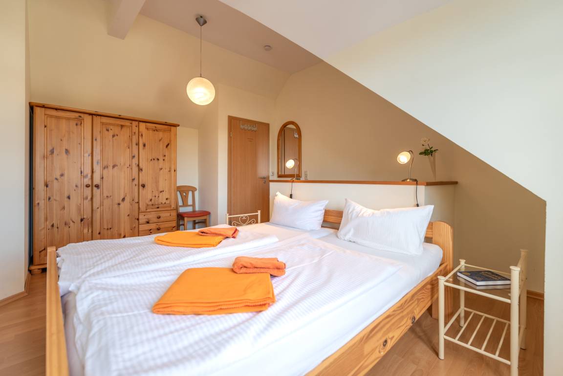 Im Dachgeschoss, das über eine Wendeltreppe erreichbar ist, befindet sich ein separater Schlafraum mit komfortablem Doppelbett. Der Raum ist mit Laminatboden ausgestattet und bietet ausreichend Platz für erholsame Nächte.