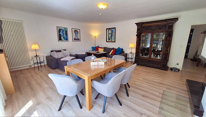 - vollwertige Küche mit Filterkaffeemaschine 4x4, Backofen, Mikrowelle, Kochfeld, Gefrierkombination, Geschirrspüler sowie Esstisch