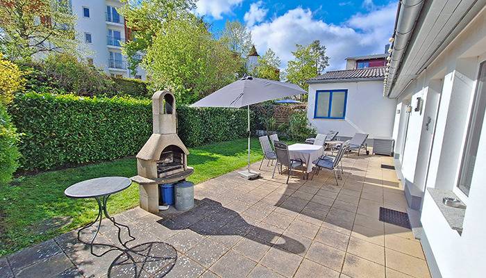 eingezäunter Garten, Südterrasse, Grill, Liegen, Sitzgarnitur