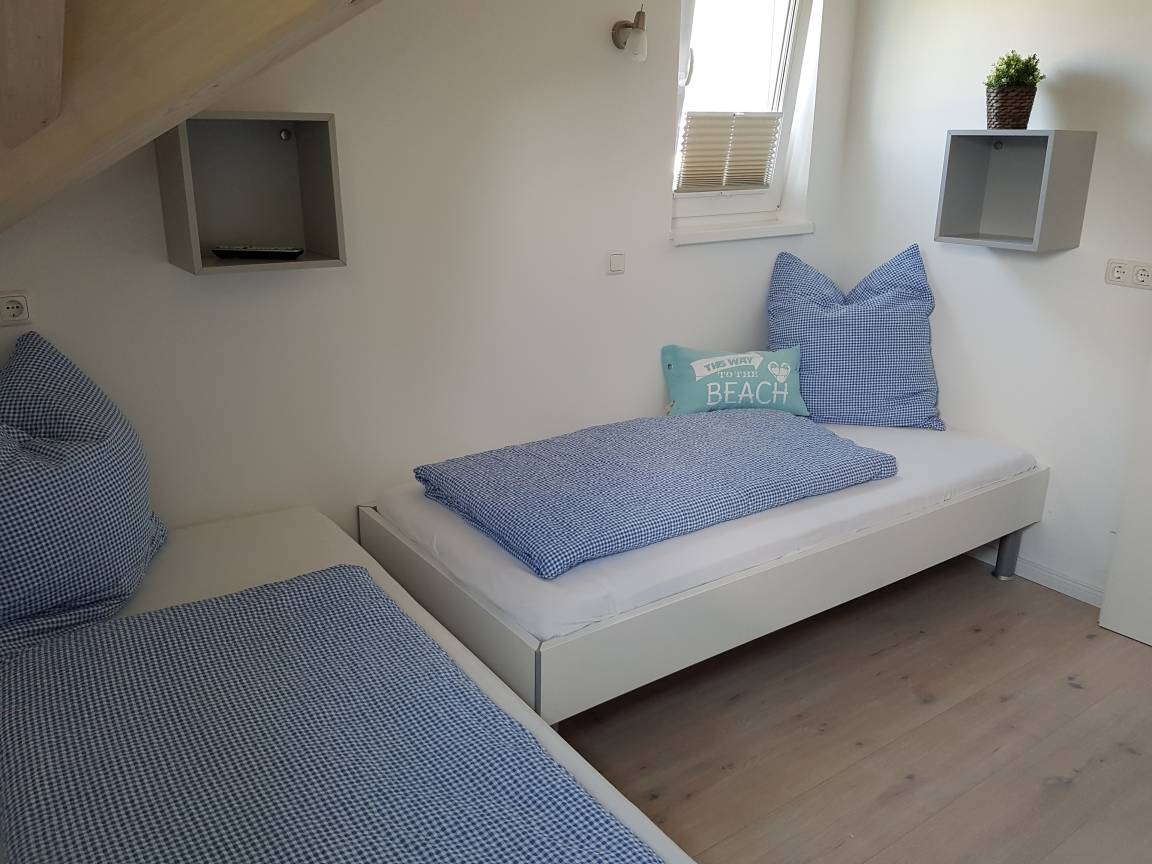 Schlafzimmer 3 (OG): 2 Einzelbetten (je 90 x 200 cm), Kleiderschrank, Fernseher, Verdunkelung: Plissee, Platz für ein Babybett vorhanden