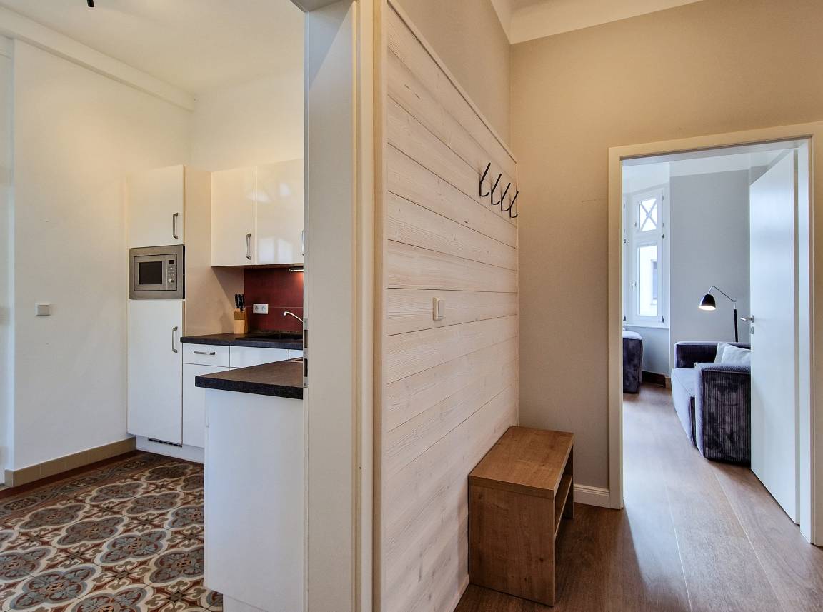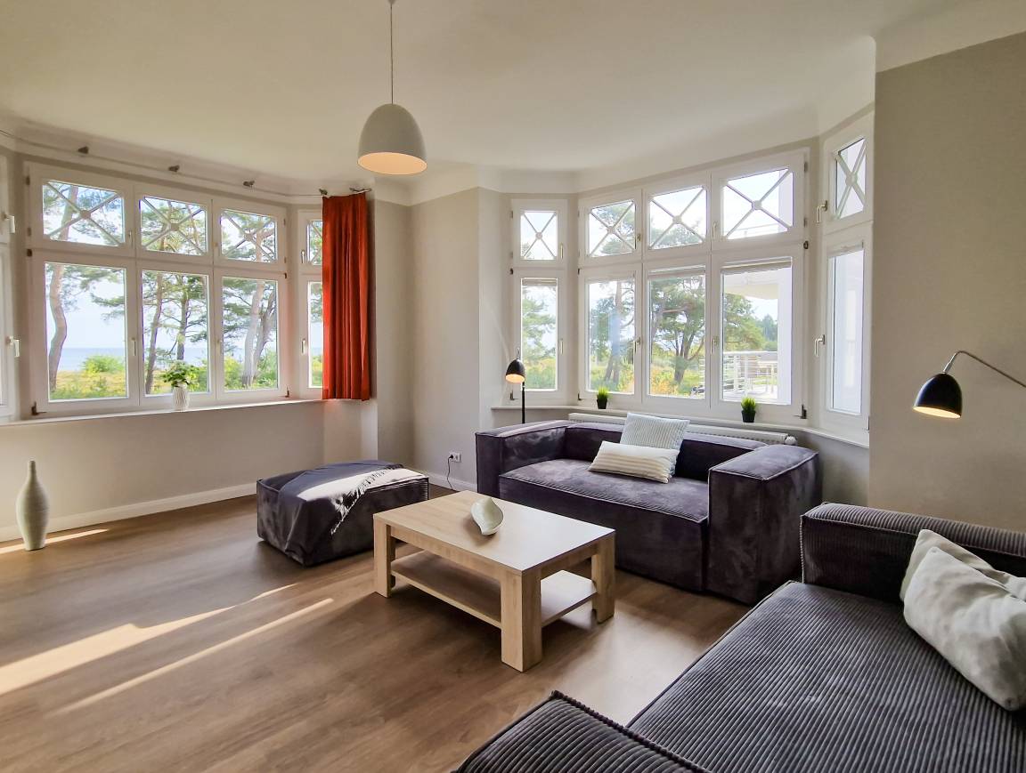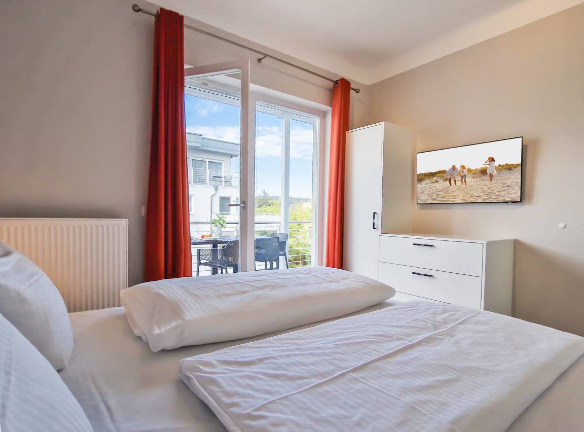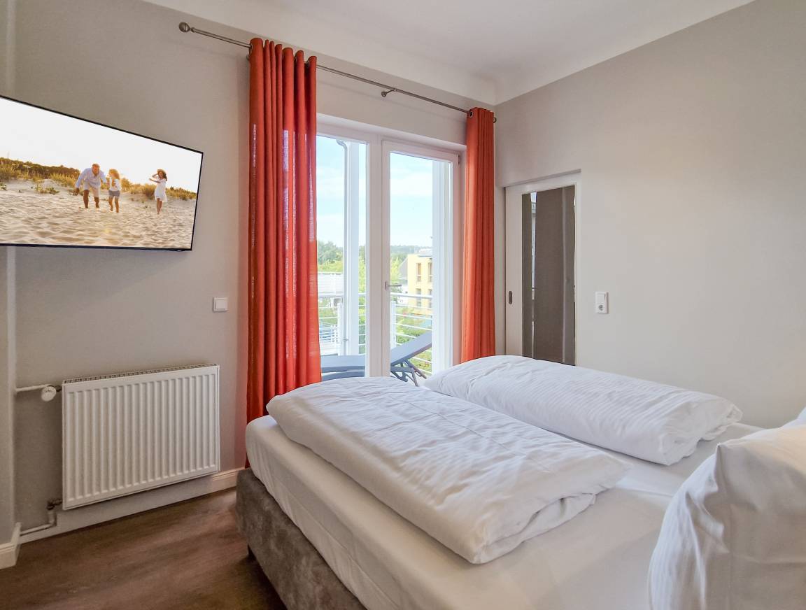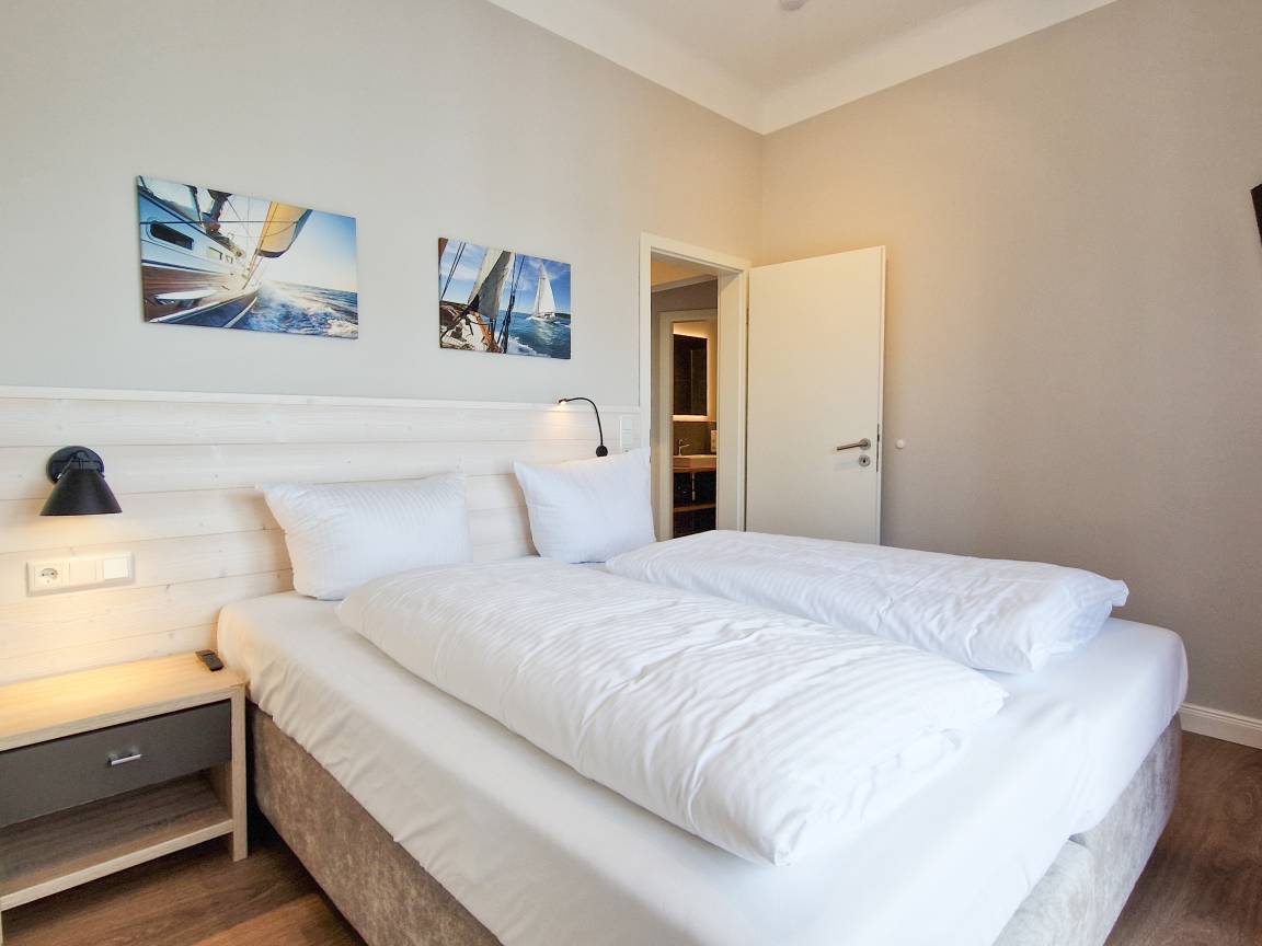 Diese 84 qm große Nichtraucher-Ferienwohnung im 1. Obergeschoss bietet den Gästen viel Platz für einen erholsamen Urlaub. Diese Wohnung besticht durch eine Seeterrasse mit schönem Blick auf die Ostsee und einen zusätzlichen Südbalkon. Der großzügige, helle Wohnraum mit Seeblick ist mit einer gemütlichen Sitzecke sowie TV mit integriertem Radio eingerichtet. In der separaten Wohnküche, ebenfalls mit Meerblick, finden Sie einen Essplatz für 4 Personen sowie eine vollausgestattete moderne Küchenzeile inklusive Geschirrspüler, Backofen und Cerankochfeld. Von hier aus können Sie die möblierte Hochterrasse zur Seeseite, mit herrlichem Blick auf die nur 10 Meter entfernte Promenade und über das Meer, betreten. Beide Schlafzimmer sind mit jeweils einem Doppelbett mit getrennten Matratzen (1,80m bzw. 1,60m x2,00m breit) und ausreichend Schrankraum, das Bad ist mit Dusche, Waschtisch und WC ausgestattet. Zusätzlich steht Ihnen ein Gäste WC zur Verfügung. Der große zum Innenhof liegende Balkon ist zum Süden ausgerichtet, von beiden Schlafzimmern zu begehen und verspricht den ganzen Tag Sonne.
