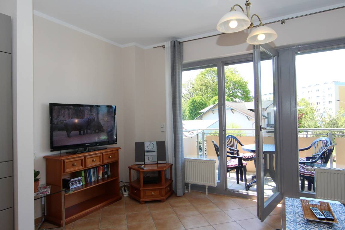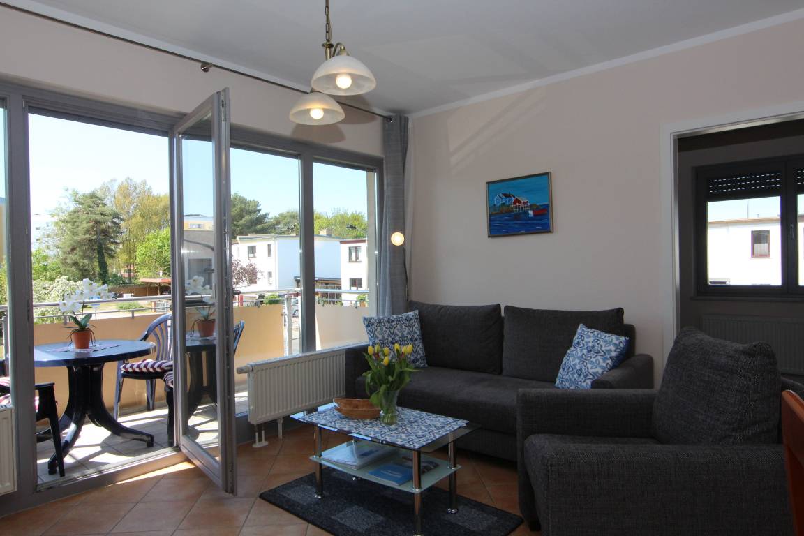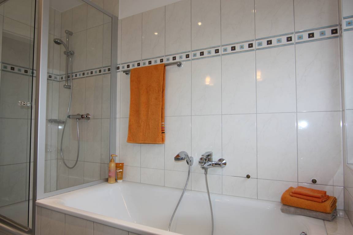Dieses 60 qm große 3-Zimmer Appartement im 1. Obergeschoss eignet sich für 2 bis 5 Personen. Im Wohnzimmer finden Sie eine gemütliche Couchecke mit Radio/TV, sowie einen separaten Essplatz. Die Vollküche mit Geschirrspüler, Ceranfeld, Backofen pp. ist ebenfalls offen im Wohnraum integriert. Der zum Süden ausgerichtete Balkon ist vom Wohnraum zu begehen. Das größere Schlafzimmer ist mit einem Doppelbett mit getrennten Matratzen, das kleinere mit zwei Einzelbetten jeweils 0,90 x 2,00 m und einem Kleiderschrank ausgestattet. Das Bad bietet Dusche, sowie Badewanne und einen Doppelwaschtisch. Das WC mit Waschgelegenheit ist separat. Der Pkw-Stellplatz befindet sich auf dem Grundstück und ist der Wohnung zugeordnet. Im Keller finden Sie einen Fahrrad-Abstellraum, Münzwaschmaschine und Münztrockner.