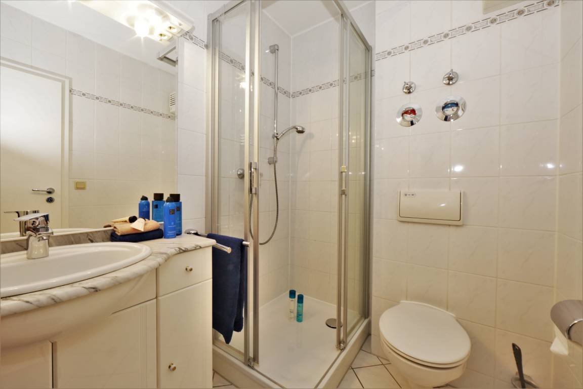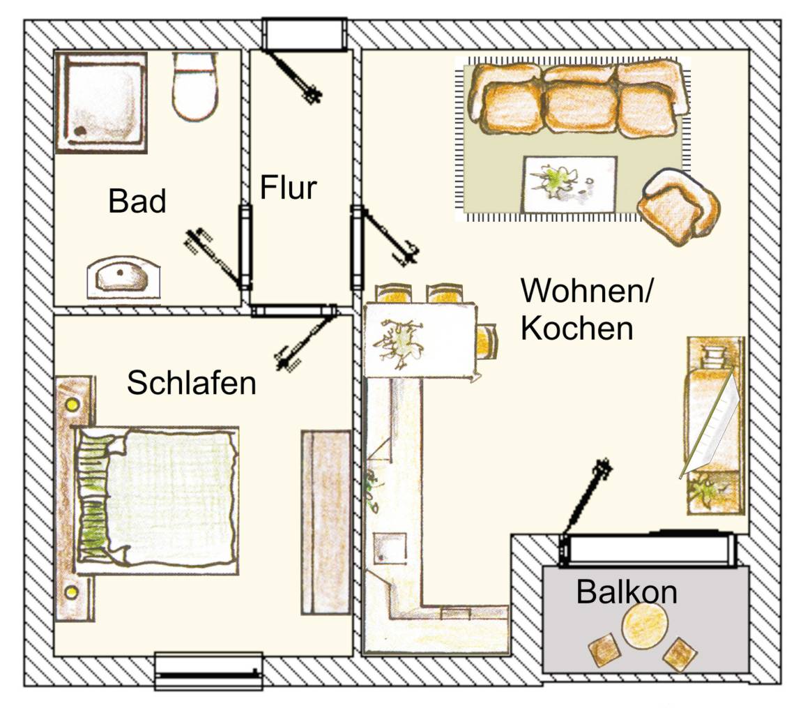 Dieses 41 qm große 2-Zimmer Appartement im 1. Obergeschoss eignet sich für 2 Personen für einen erholsamen Urlaub. Im Wohnraum finden Sie eine gemütliche Couchecke mit Flat-TV sowie die offene Vollküche, die mit Cerankochfeld, Geschirrspüler, Kühlschrank, Mikrowelle etc. ausgestattet ist. An dem zur Küche gehörigen kleinen Essplatz finden bis zu 3 Personen Platz. Das Schlafzimmer ist mit einem Doppelbett mit getrennten Matratzen (90 x 200) und einem großen Kleiderschrank ausgestattet. Für eine zusätzliche Personen lässt sich das Sofa in ein Bett mit Matratze (140 x 200) verwandeln. Im Bad stehen Ihnen eine Dusche mit Echtglasabtrennung und Waschbecken/WC zur Verfügung. Der möblierte Südbalkon, der vom Wohnraum begehbar ist, lockt die Gäste schon zum Frühstück nach draußen. Ein PKW-Stellplatz befindet sich auf dem Grundstück und ist der Wohnung zugeordnet. Ein Fahrradständer steht den Gästen im Kellergeschoss ebenso zur Verfügung wie Waschmaschine und Trockner gegen Gebühr.