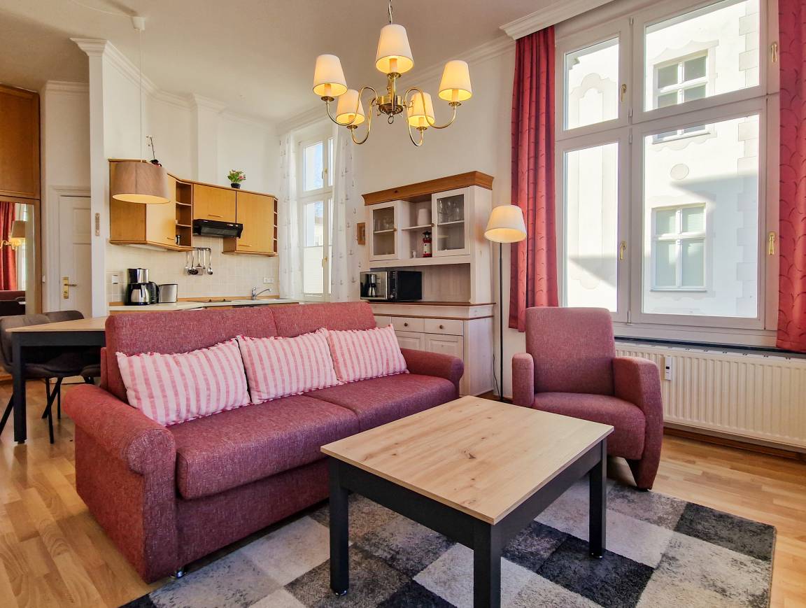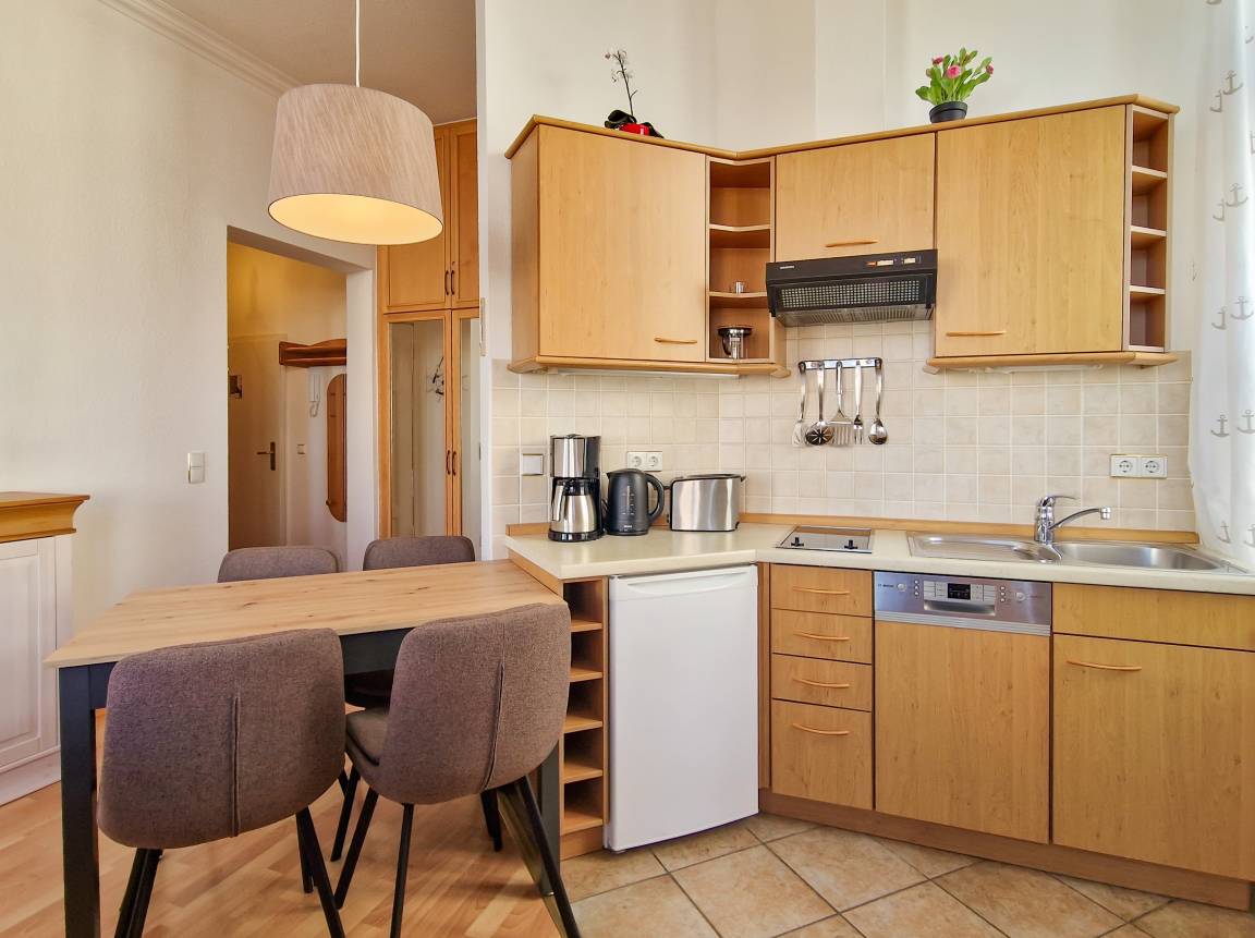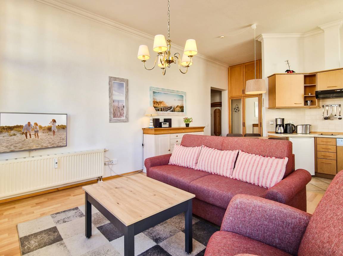 Dieses 45 qm große 2-Zimmer Appartement befindet sich im Erdgeschoss zur Meerseite. Sie können vom Wohnzimmer vorbei an der ersten Häuserreihe einen Blick auf die Ostsee erhaschen. Der Wohnraum ist mit einer gemütlichen Couch mit Schlaffunktion (Liegefläche 140x200) und einem Sessel sowie TV eingerichtet. Ebenfalls im Wohnraum integriert sind eine Küchenzeile inklusive Ceranfeld, Kühlschrank mit Gefrierfach, Geschirrspüler, Mikrowelle mit Grill und Backfunktion sowie ein Essplatz für 3 Personen. Das Schlafzimmer bietet den Gästen ein Doppelbett mit getrennten Matratzen (90 x 200) und einen zusätzlichen TV. Das Bad ist mit Dusche und Waschbecken/WC ausgestattet. Im Keller befinden sich Waschmaschine und Trockner. Der Pkw-Stellplatz befindet sich auf dem Grundstück direkt am Haus.