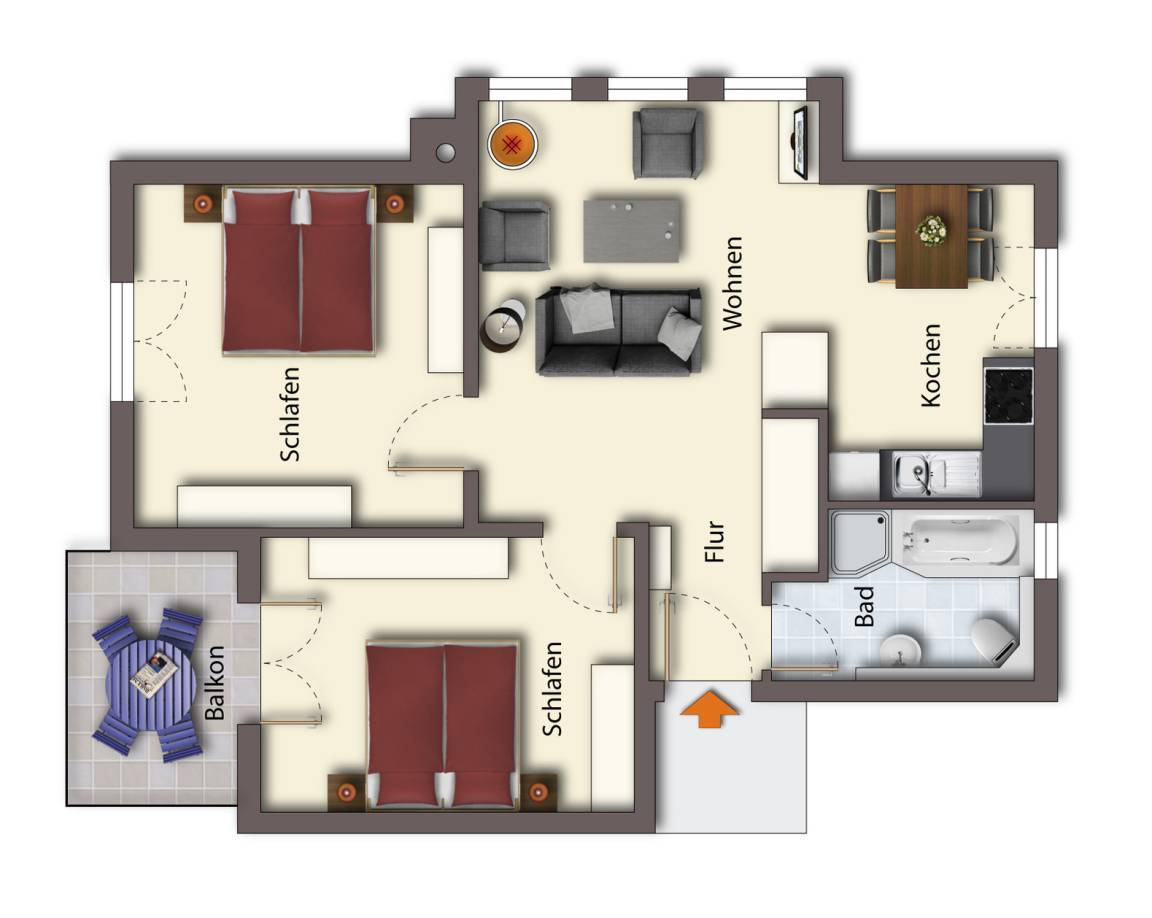 69 m² Ferienwohnung ∙ 2 Schlafzimmer ∙ 4 Gäste