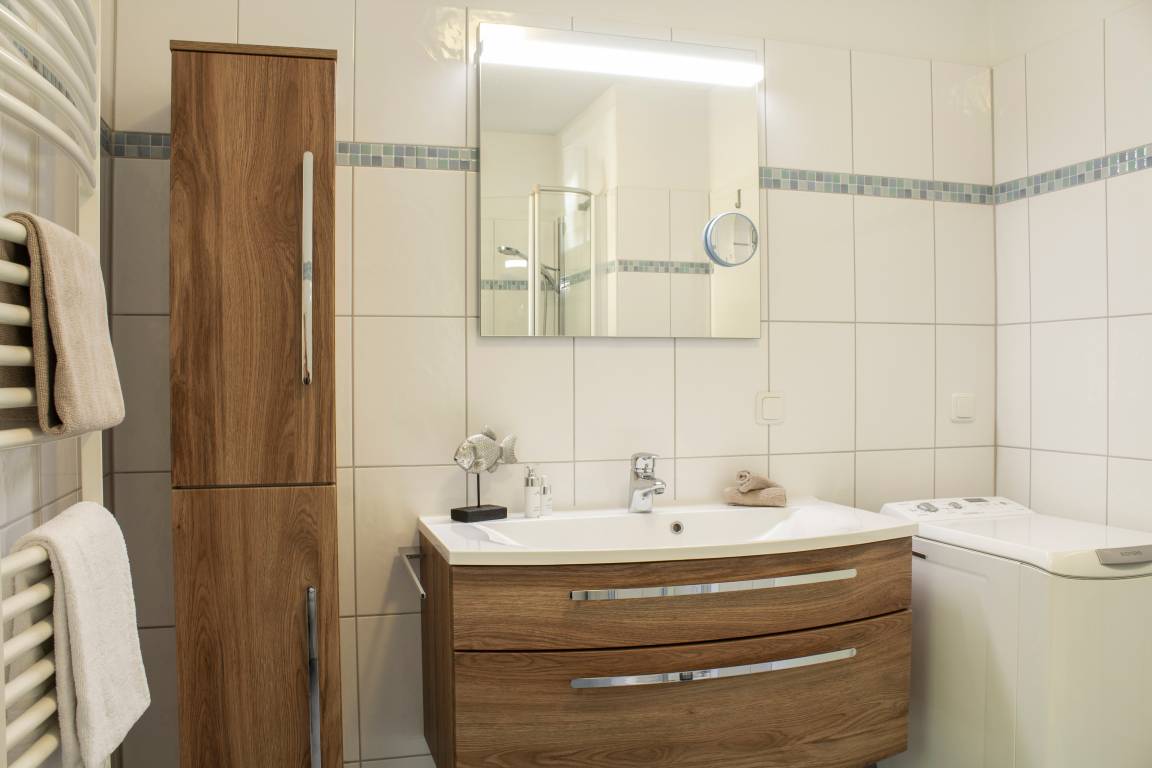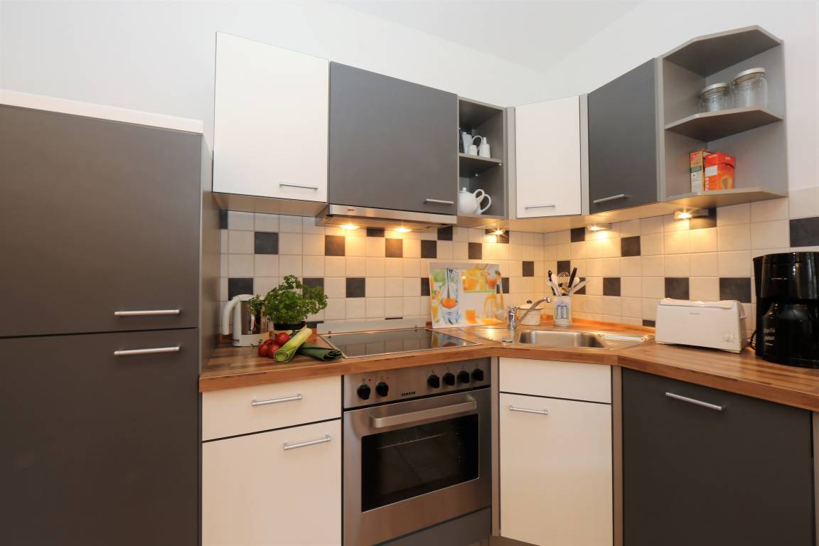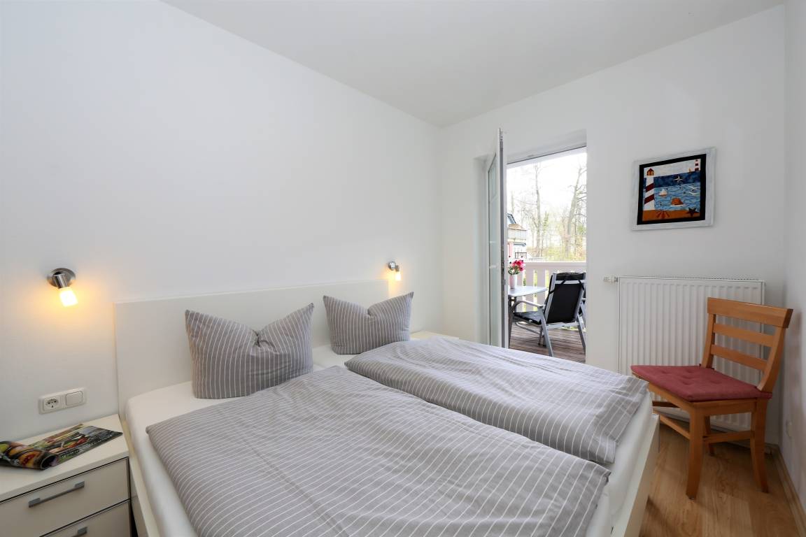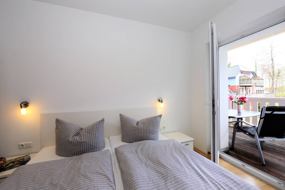 Diese liebevoll eingerichtete 3-Zimmer Wohnung ist 64 qm groß und liegt im 1. Obergeschoss. Sie bietet maximal 4 Personen Platz für einen erholsamen Ostseeaufenthalt. Im Wohnraum finden Sie ein bequemes Sofa mit zwei Sesseln zum Entspannen vor sowie Couchtisch und Flat TV. Der Essplatz und die Küchenzeile incl. Geschirrspüler, Ceranfeld, Backofen, Kühlschrank etc. sind ebenfalls offen im hinteren Bereich des Wohnraums integriert. Auf dem großen überdachten Balkon zum Südosten genießen Sie viele Sonnenstunden. Beide Schlafzimmer sind mit einem komfortablen Doppelbett mit getrennten Matratzen (90 x 200) und ausreichend Schrankraum eingerichtet. Das großzügige Bad mit Fenster ist mit einer Dusche mit Echtglasabtrennung und Waschbecken/WC ausgestattet. Außerdem steht den Gästen hier eine Waschmaschine zur Verfügung. Der PKW-Stellplatz befindet sich auf dem Grundstück und ist der Wohnung zugeordnet. Mitgebrachte Fahrräder können sicher im eigenen Keller abgestellt werden.