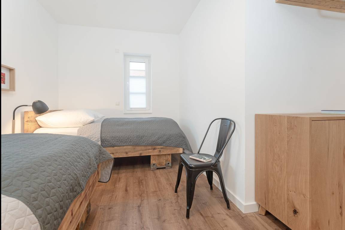 Schlafzimmer 2: 2 Einzelbetten (je 90x200 cm), Kleiderschrank, Verdunkelung: Rollo, kein Platz für Babybett vorhanden