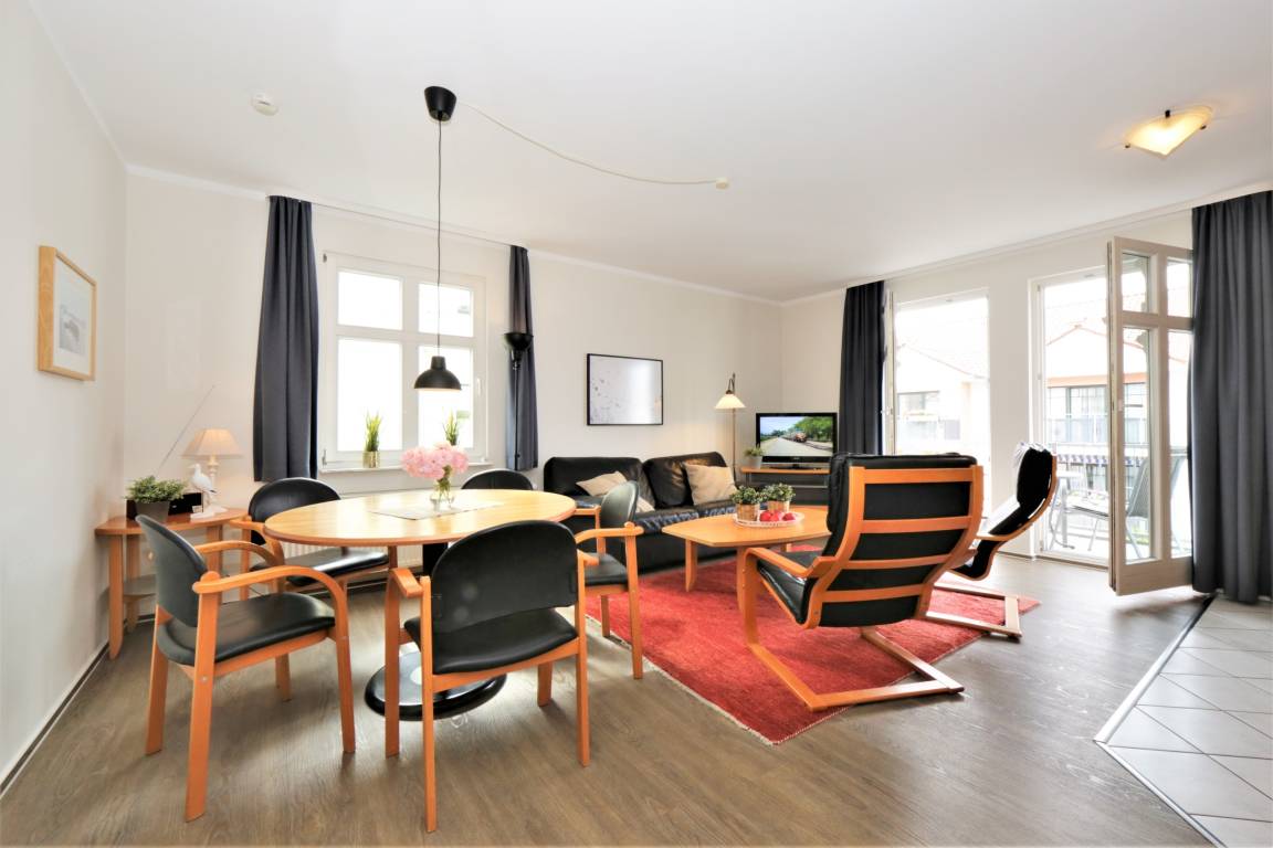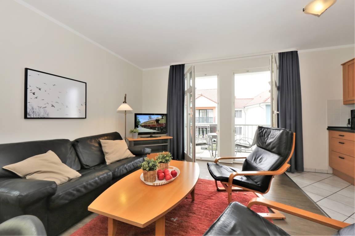 Dieses 64 qm große 3-Zimmer-Appartement im 2. Obergeschoss können Sie über den Fahrstuhl erreichen. Das großzügige gemütliche Wohnzimmer mit einem Sofa und großem Esstisch bietet bis zu 4 Personen Platz zum Essen und Relaxen. Die Vollküche ist ebenfalls offen im Wohnraum integriert und mit Geschirrspüler, Backofen mit Cerankochfeld, Kühlschrank etc. ausgestattet. Das größere Schlafzimmer ist mit einem Doppelbett mit getrennten Matratzen (90 x 200), das kleinere mit zwei Einzelbetten (90 x 200) sowie ausreichend Schrankraum ausgestattet. Im Bad stehen Ihnen Dusche und Waschbecken/WC zur Verfügung. Von dem westlich ausgerichteten Balkon, der vom Wohnraum zu betreten ist, können Sie einen Blick auf die Ostsee erhaschen. Ein PKW-Stellplatz befindet sich in der zum Haus gehörigen Tiefgarage und ist der Wohnung zugeordnet. Ein Fahrradständer steht den Gästen im Kellergeschoss ebenso zur Verfügung wie Waschmaschine und Trockner gegen Gebühr.