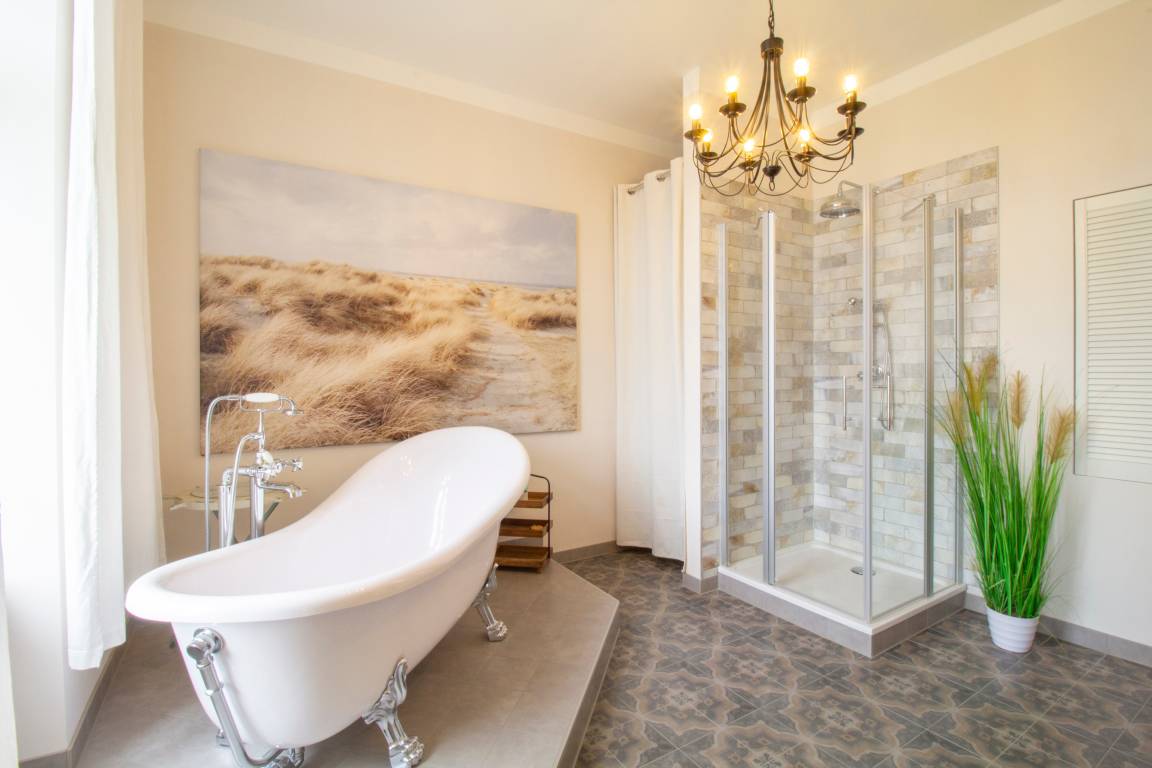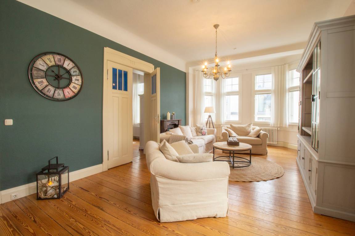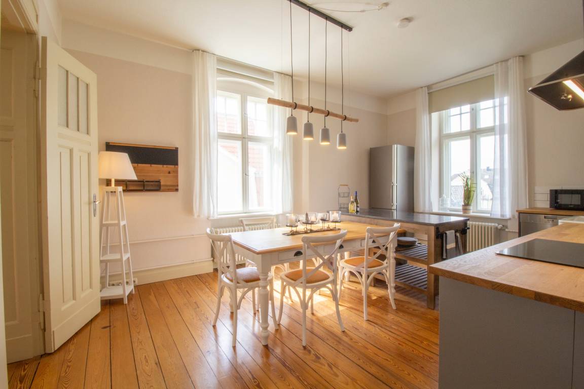 Willkommen in dieser traumhaften 3-Raum-Wohnung im 2. Obergeschoss im Herzen eines charmanten Altbaus! Die Wohnung begrüßt Sie mit einem geräumigen Eingangsbereich mit glänzenden Holzdielen, die den eleganten Charakter dieses Zuhauses unterstreichen. Die Wohnung erstreckt sich über großzügige 95 Quadratmeter und bietet Platz für 2 – 4 Personen. Lassen Sie sich von einem modernen Flair und einer geschmackvollen Einrichtung verzaubern. Zwei geräumige Schlafzimmer bieten reichlich Stauraum und Gemütlichkeit für erholsame Nächte, jeweils ausgestattet mit einem komfortablen Doppelbett in der Größe von 180x200cm. Ein Zimmer ist zusätzlich mit einem gemütlichen Boxspringbett in gleicher Größe ausgestattet, um Ihren Aufenthalt noch angenehmer zu gestalten. Das helle und einladende Wohnzimmer lädt zum Verweilen ein, mit einer bequemen Couch und zwei großzügigen Sesseln, von denen aus Sie einen kleinen Blick auf die Ostsee erhaschen können. Durch die majestätischen Flügeltüren des Wohnzimmers gelangen Sie in die moderne offene Küche, die mit hochwertigen Geräten und einem Esstisch für bis zu 5 Personen ausgestattet ist. Hier finden Sie alles, was das Herz begehrt: Induktionskochfeld, Kühlschrank, Gefrierschrank, Geschirrspüler, Mikrowelle und eine Kaffeemaschine – perfekt für gesellige Kochabende und kulinarische Genüsse. Das absolute Juwel dieser Wohnung ist das großzügige Vintage-Badezimmer, das mit einer freistehenden Badewanne und einer geräumigen Eckdusche zum Entspannen einlädt. Hier können Sie den Alltag hinter sich lassen und in luxuriösem Ambiente zur Ruhe kommen.