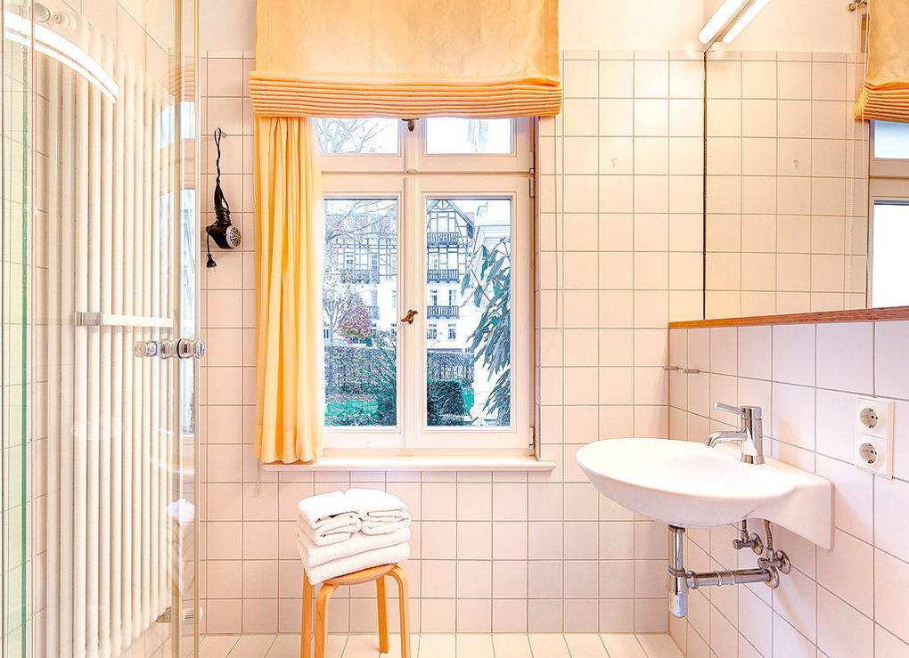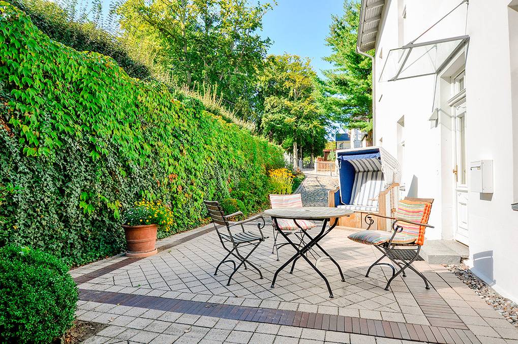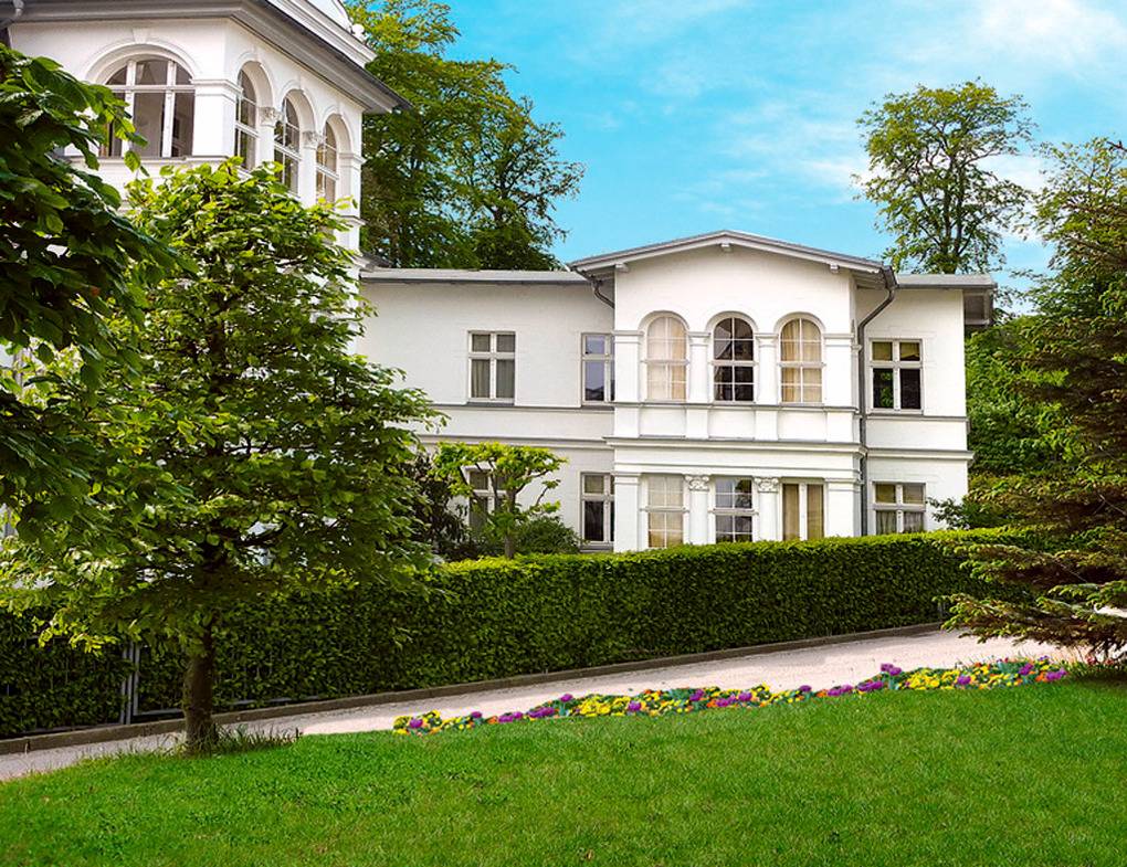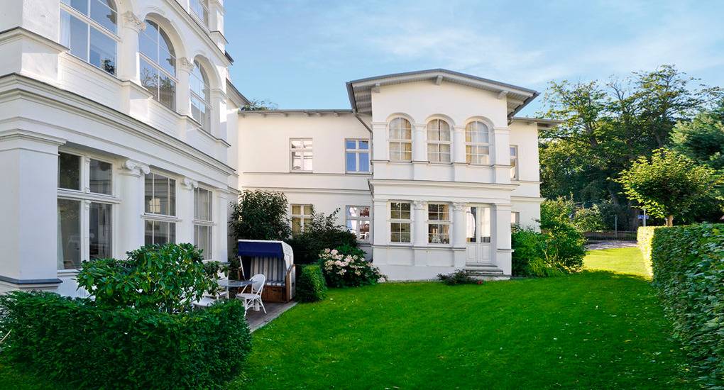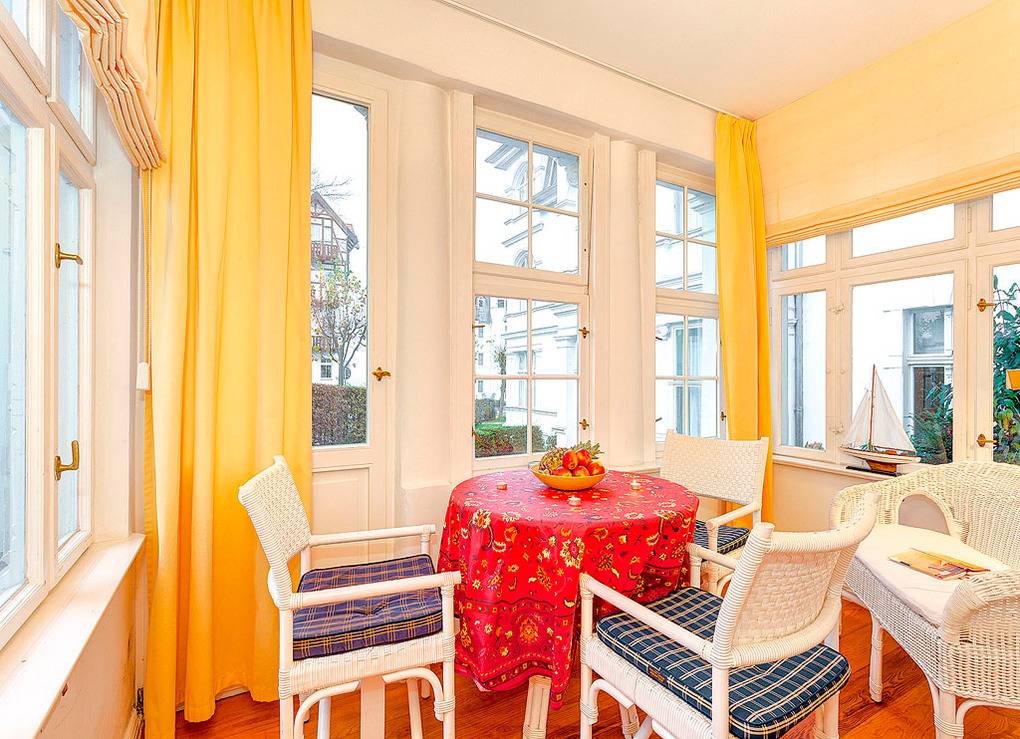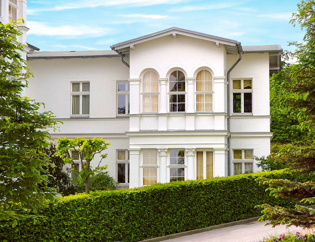 Haus: Sehr schöne, kleine Bäderstil-Villa, bestehend aus zwei Komfort-Wohnungen mit Kaminofen. Jede Fewo erstreckt sich über die gesamte Etage. Schöne, helle Räume, jeder mit Wasserblick. Moderne, geschmackvolle Einrichtung. Kostenloser Internetzugang über W-Lan. Die ehemals offenen Veranden wurden stilvoll verglast und bieten ebenfalls Meerblick durch die Villen in erster Reihe. Allergikerfreundliche Nichtraucherwohnungen. Zentralheizung.