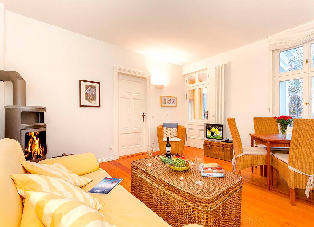 D 12.12A Wohnung 2-4 Pers.: 3-Zimmerwohnung mit 60 qm Wohnfläche, Parterre. Wohn-/Essraum mit Kaminofen, gemütlicher Sitzgruppe (Schlafcouch 2 Pers.), Sat-TV, Radio/CD, Telefon, Esstisch. Veranda mit weiterer Sitzecke, Meerblick. Separate Küche mit Mikrowelle (Backfunktion), Spülmaschine. Doppelzimmer. Bad: Du, Wb, WC, Handtuchwärmer, Fön. Eigene kleine Terrasse mit Sitzmöbeln, Strandkorb.