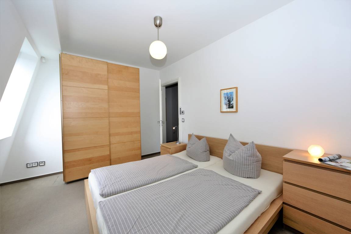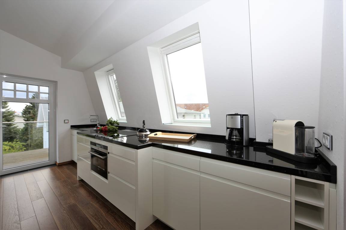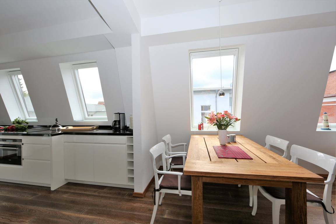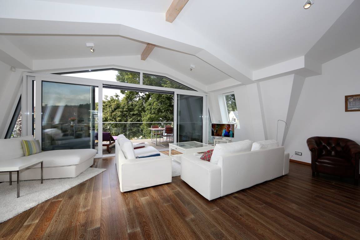 Diese 141 qm große Mansarden Dachwohnung strahlt in seiner modernen Bauweise einen Hauch von Extravaganz aus. Die Wohnung mit zwei Schlafzimmern erstreckt sich über das gesamte Dachgeschoss des Hauses, ohne durch Dachschrägen beeinträchtigt zu werden. Der großzügige Wohnraum mit Parkettboden bildet eindeutig den Mittelpunkt der Wohnung. In der großen hellen Sofaecke können die Gäste gemütlich beisammen sitzen oder einfach nur entspannen. Zum Lesen und Träumen lädt ein zusätzliches daybed ein. Ein großer Flat-TV ist in dieser Wohnung ein Muss. Ein Highlight der Wohnung sind die beiden großen möblierten Balkone, die den ganzen Tag Sonne und einen schönen Blick auf die benachbarten Villen versprechen. In der großen offenen Küche mit Fenster, die mit Geschirrspüler, Kühl- sowie Gefrierschrank, Backofen mit Cerankochfeld etc. ausgestattet ist, macht es Spaß, die Mahlzeiten zuzubereiten. Ein Esstisch, der 4 Personen Platz bietet, steht für gemeinsame Mahlzeiten zur Verfügung. Ein Schlafzimmer ist mit einem Doppelbett mit getrennten Matratzen (90 x 200), einem Kleiderständer, einer Kommode sowie einem zusätzlichen Flat-TV ausgestattet. An dieses Schlafzimmer grenzt ein großzügiges hochwertig ausgestattetes Bad en suite, mit Echtglasdusche, Badewanne und Waschtisch/WC. Zusätzlich steht ein Gäste-WC zur Verfügung. Das zweite Schlafzimmer ist ebenfalls mit einem Doppelbett mit getrennten Matratzen (90 x 200) und einem Kleiderschrank eingerichtet. Ihren Pkw sowie Fahrräder können die Gäste auf dem Grundstück abstellen.