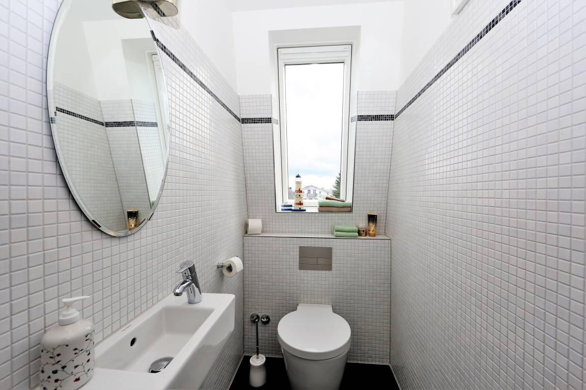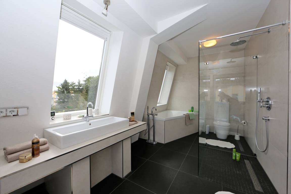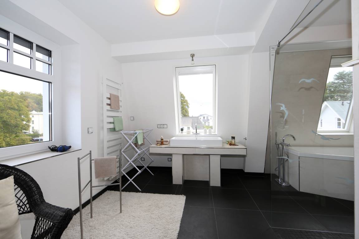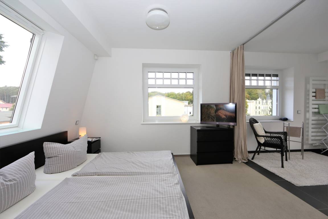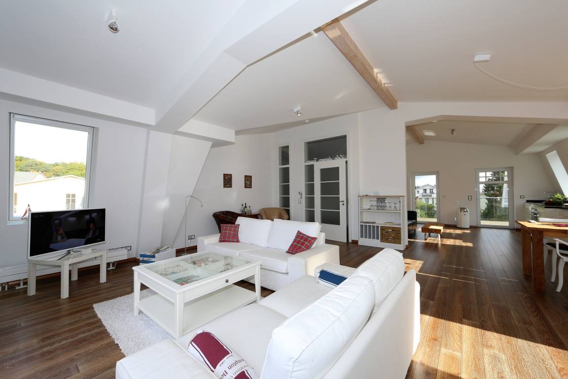 Diese 141 qm große Mansarden Dachwohnung strahlt in seiner modernen Bauweise einen Hauch von Extravaganz aus. Die Wohnung mit zwei Schlafzimmern erstreckt sich über das gesamte Dachgeschoss des Hauses, ohne durch Dachschrägen beeinträchtigt zu werden. Der großzügige Wohnraum mit Parkettboden bildet eindeutig den Mittelpunkt der Wohnung. In der großen hellen Sofaecke können die Gäste gemütlich beisammen sitzen oder einfach nur entspannen. Zum Lesen und Träumen lädt ein zusätzliches daybed ein. Ein großer Flat-TV ist in dieser Wohnung ein Muss. Ein Highlight der Wohnung sind die beiden großen möblierten Balkone, die den ganzen Tag Sonne und einen schönen Blick auf die benachbarten Villen versprechen. In der großen offenen Küche mit Fenster, die mit Geschirrspüler, Kühl- sowie Gefrierschrank, Backofen mit Cerankochfeld etc. ausgestattet ist, macht es Spaß, die Mahlzeiten zuzubereiten. Ein Esstisch, der 4 Personen Platz bietet, steht für gemeinsame Mahlzeiten zur Verfügung. Ein Schlafzimmer ist mit einem Doppelbett mit getrennten Matratzen (90 x 200), einem Kleiderständer, einer Kommode sowie einem zusätzlichen Flat-TV ausgestattet. An dieses Schlafzimmer grenzt ein großzügiges hochwertig ausgestattetes Bad en suite, mit Echtglasdusche, Badewanne und Waschtisch/WC. Zusätzlich steht ein Gäste-WC zur Verfügung. Das zweite Schlafzimmer ist ebenfalls mit einem Doppelbett mit getrennten Matratzen (90 x 200) und einem Kleiderschrank eingerichtet. Ihren Pkw sowie Fahrräder können die Gäste auf dem Grundstück abstellen.