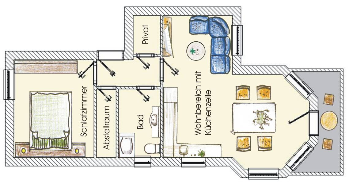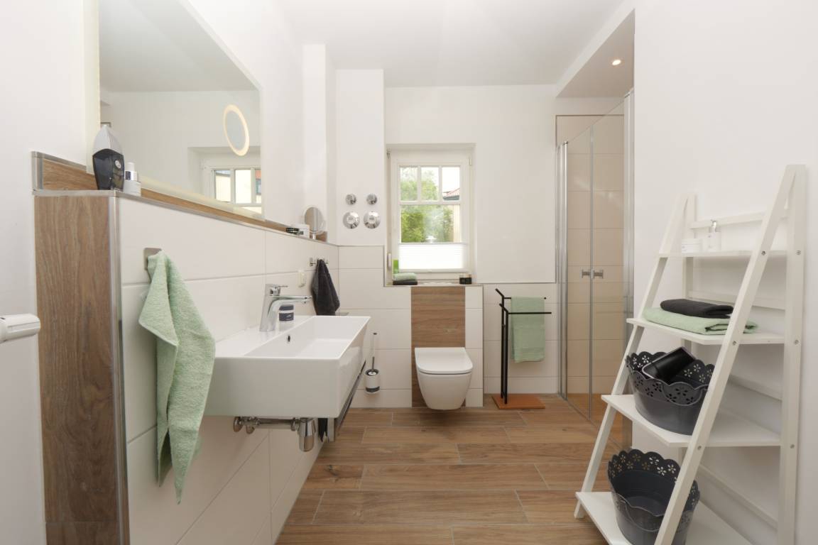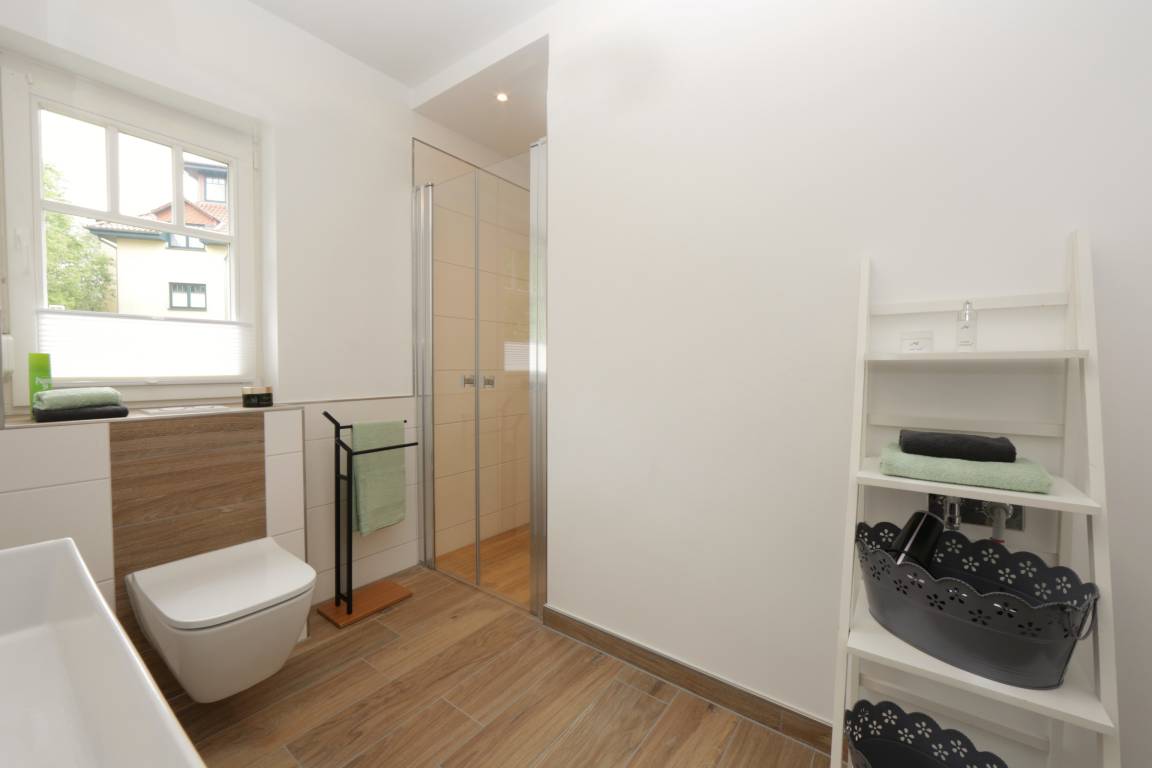 Diese herrlich sonnige 2 Zimmer-Wohnung bietet mit Ihren 59 qm 2 – 4 Personen allen Komfort für einen erholsamen Ferienaufenthalt. Der hell eingerichtete Wohnraum verfügt über eine gemütliche Sitzecke (mit Schlaffunktion) und Flat TV. Von hier aus finden die Gäste auch Zugang zu der ruhigen Terrasse, die ins Grüne schaut und viele Sonnenstunden verspricht. Der Essplatz für 4 Personen sowie eine Vollküche incl. Kühlschrank, Geschirrspüler, Backofen mit Ceranfeld, Mikrowelle etc. sind ebenfalls im Wohnbereich integriert. Essplatz und Küche gestatten ebenfalls einen Blick nach draußen. Das großzügige Schlafzimmer ist mit einem Boxspringbett (1,80 m x 2,00 m mit durchgehenden Topper) und genügend Schrankraum ausgestattet. Ein Bad mit Dusche und Waschbecken/WC runden diese Wohnung ab. Ein Pkw-Stellplatz befindet sich direkt vor der Tür.