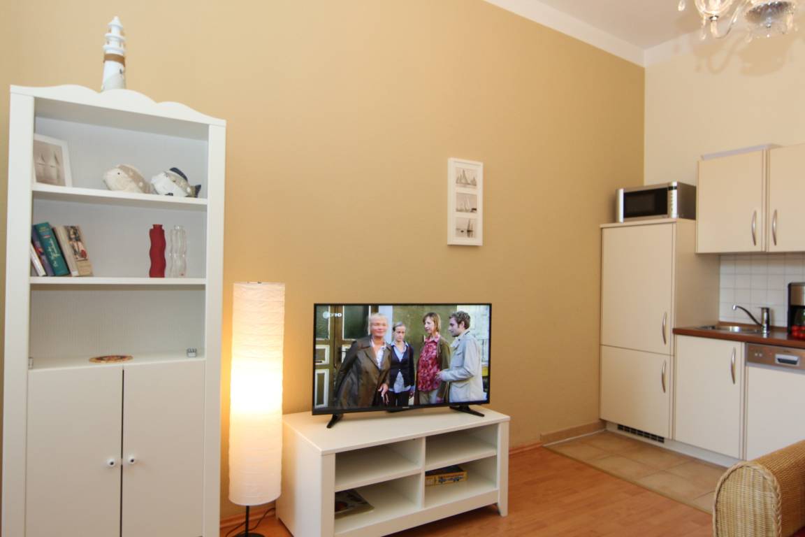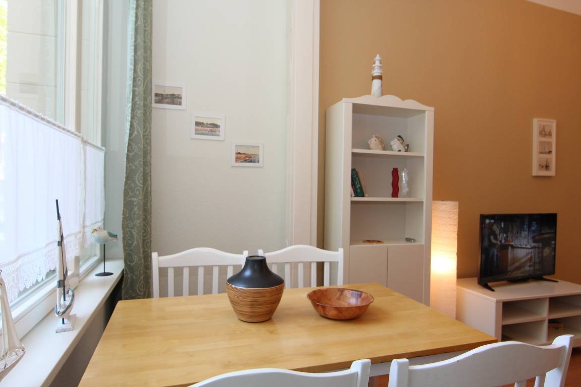 Dieses 45 qm große 2-Zimmer-Appartement im Erdgeschoss bietet 2 bis maximal 3 Personen Platz für einen erholsamen Usedom-Aufenthalt. Im Wohnraum steht den Gästen eine gemütliche Sitzgarnitur (Schlafcouch 1,20 x 2,00 m) zum Relaxen und Fernsehen zur Verfügung. Ein Flat-TV ist selbstverständlich. In der angrenzenden lichtdurchfluteten, geschlossenen Loggia (Fenster lassen sich öffnen) in südlicher Ausrichtung können an einem großen Esstisch die gemeinsamen Mahlzeiten eingenommen werden. Die Küchenzeile mit Geschirrspüler, Ceranfeld, Mikrowelle etc. ist ebenfalls offen im hinteren Wohnbereich integriert. Das großzügige Schlafzimmer ist mit einem Doppelbett mit getrennten Matratzen (90 x 200) und reichlich Schrankraum ausgestattet. Das kleine Bad bietet Dusche sowie Waschbecken/WC.