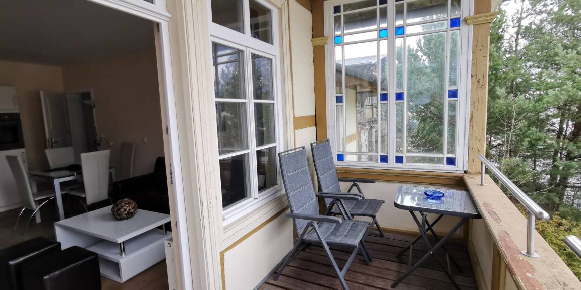 Sie wohnen im Obergeschoß in einer liebevoll sanierten Villa im Bäderarchitekturstil, in ruhiger und zentraler Lage. Zum Strand sind es nur ca. 100 Meter. Das Appartement ist 51 qm groß und mit modernen Möbeln ausgestattet. Der moderne Bio-Kamin lädt zum Ausklang eines romantischen Abends ein. Es bietet insgesamt zwei Schlafplätze (Doppelbett 140x200) im separaten Schlafzimmer. Die Böden sind mit rustikalen Landhausdielen und Fliesen ausgelegt. Im modernen Bad sind ein Bidet, eine Dusche, eine Badewanne und ein beheizter Handtuchhalter vorhanden. Eine großzügige offene Balkonveranda, in Südostausrichtung, lädt zum Verweilen ein. Am großen Aussengrill kann Leckeres zubereitet werden. Einen separaten Stellplatz finden Sie hinter der Villa. Fahrräder können untergestellt werden.