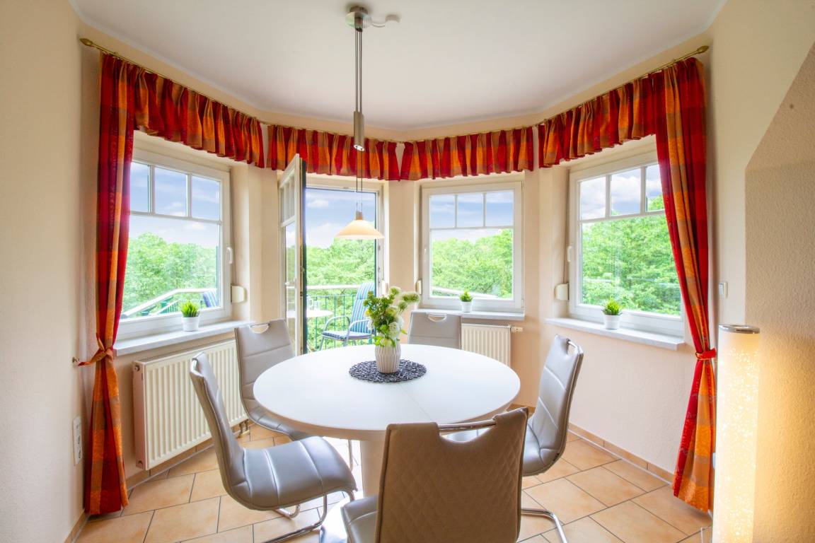 Diese herrlich sonnige Maisonettwohnung bietet mit Ihren 78 qm 2 – 4 Personen allen Komfort für einen erholsamen Ferienaufenthalt. Im unteren Bereich befindet sich ein großzügiger heller Wohnbereich. Das Wohnzimmer ist ausgestattet mit einer komfortablen Sitzgarnitur sowie TV und Radio. Der Essplatz für 4 Personen steht vor den süd-östlich ausgerichteten Fenstern. Von hier aus finden die Gäste auch Zugang zu dem ruhigen Balkon, der ins Grüne schaut und erholsame Sonnenstunden verspricht. Ebenfalls offen im Wohnbereich integriert ist eine moderne Vollküche incl. Kühlschrank, Geschirrspüler, Backofen mit Ceranfeld etc. Das großzügige Schlafzimmer ist mit einem Doppelbett mit getrennten Matratzen (90 x 200) und ausreichend Schrankraum eingerichtet. Das Bad ist mit Badewanne und Waschbecken/WC ausgestattet und befindet sich ebenfalls auf der unteren Ebene. Eine komfortable Treppe aus dem Flur führt in das Penthouse im oberen Bereich, der als Wohn-/Schlafbereich dient und einen Rundumblick erlaubt. Eine kleine Sitzgruppe mit einem zweiten TV lädt zum Entspannen oder Zurückziehen ein. Der helle schöne Raum eignet sich hervorragend zum Lesen. Ein weiteres Doppelbett steht den Gästen zum Schlafen zur Verfügung. Ein PKW-Stellplatz sowie ein Fahrradschuppen befinden sich direkt vor der Haustür.