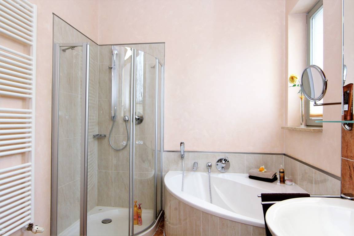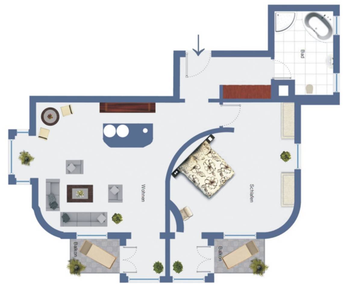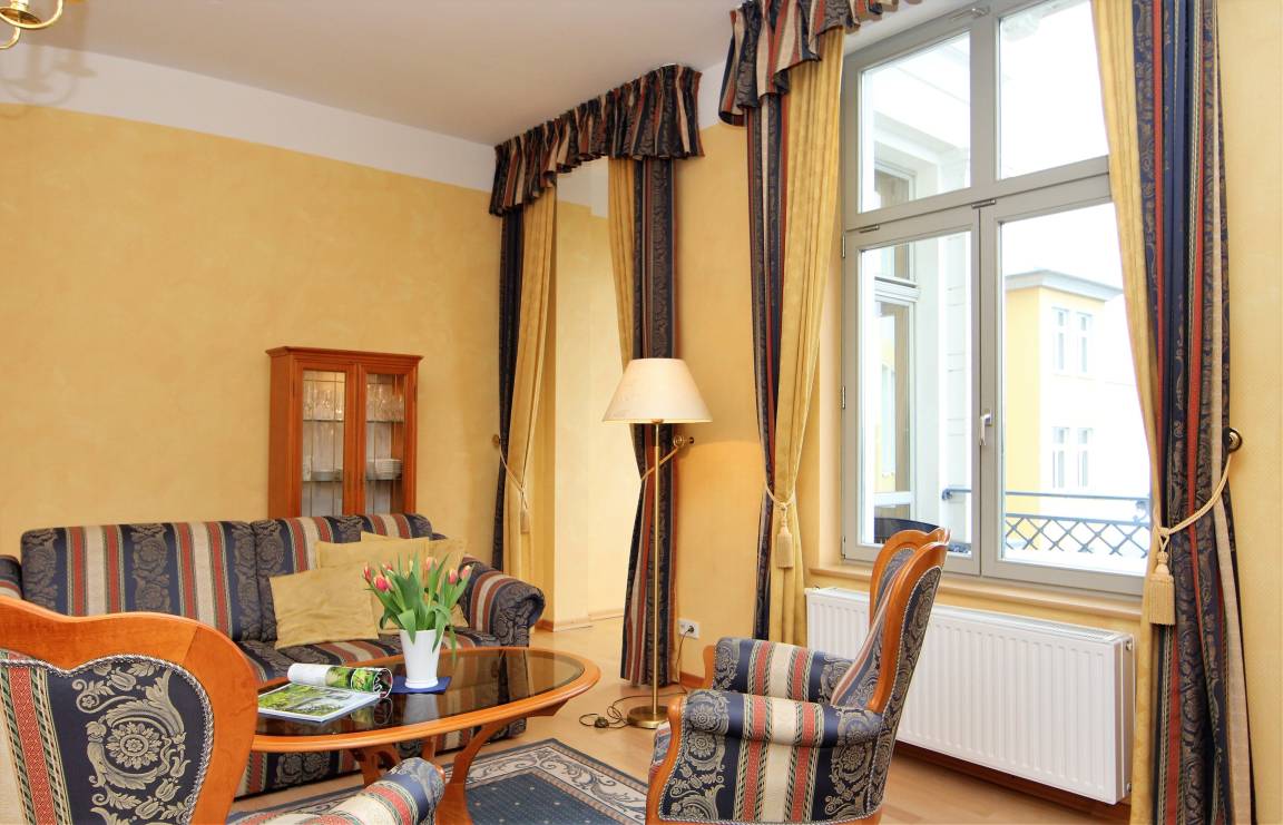 Die mit 79 qm großzügige 2-Zimmer Wohnung im 2. Obergeschoss besticht in jeder Hinsicht durch die tolle Lage und die komfortable Ausstattung. Die der ursprünglichen Architektur entsprechenden Ausstattung der Appartements ist elegant und anspruchsvoll und lässt den Alltag schnell verfliegen. Hochwertige italienische Möbel, gepaart mit modernem Komfort, prägen das Wohn- und Wohlgefühl. Der stilvolle Wohnbereich ist mit einer gemütlichen Sitzecke (mit Schlaffunktion für zwei weitere Personen) mit Flat-TV/DVD und Radio/CD eingerichtet. Die hohen Fenster spenden viel Licht. Der kleine Erker ist ein lauschiges Plätzchen zum Lesen oder Träumen. Hier sitzen Sie in der ersten Reihe, um das Treiben rund um die Konzertmuschel zu beobachten. Eine kleine Küchenzeile mit Geschirrspüler, Mikrowelle, Kühlschrank und Cerankochfeld sowie ein Essplatz sind ebenfalls offen im Wohnbereich integriert. Im geräumigen Schlafzimmer befinden sich ein Doppelbett mit getrennten Matratzen (90x200) sowie Schrankraum für Ihre Kleidung und Gepäck. Der angrenzende Erker mit Sekretär bietet ein wenig Zurückgezogenheit. Das hochwertig ausgestattete Tageslichtbad bietet Ihnen sowohl eine Badewanne als auch eine Dusche, Waschtisch/WC und Fön. Die zwei kleineren Balkone der Wohnung betreten Sie vom Wohn- als auch vom Schlafzimmer aus. Genießen Sie hier einen weiten Blick auf das Meer und die Seebrücke bis nach Swinemünde und auf das Leben in der Mitte Heringsdorfs und spüren Sie die Atmosphäre des mondänen Seeschlosses. Für Ihren Komfort befindet sich ein Aufzug im Haus und ein Fahrradkeller den Sie nutzen können. Der Pkw- Stellplatz befindet sich im Parkhaus, ca. 5 min fußläufig entfernt.