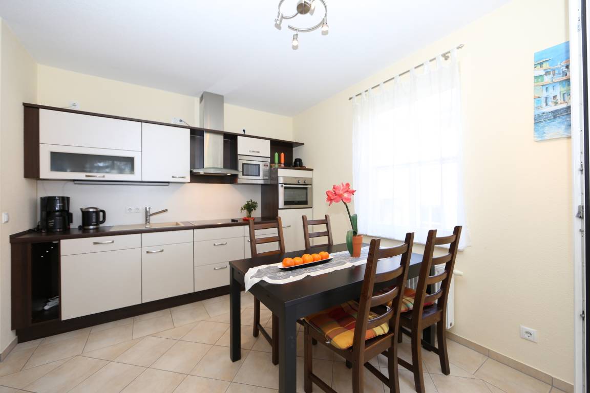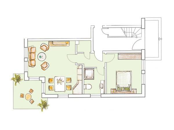 Dieses gemütlich eingerichtete 60 qm große 2-Zimmer Appartement liegt im Erdgeschoss und eignet sich für 2-3 Personen. Im Wohnraum finden Sie eine gemütliche Couch (mit Schlaffunktion 1,30x1,80m) mit Sessel, Couchtisch, TV und Radio/CD. Für wohlige Wärme in der kühleren Jahreszeit sorgen die Fußbodenheizung und ein Kaminofen. Die Vollküche inclusive Backofen, Mikrowelle, Kühlschrank, Geschirrspüler etc. sowie der Essplatz sind offen im Wohnbereich integriert und laden zum Zubereiten und Genießen der gemeinsamen Mahlzeiten ein. Die möblierte Terrasse in südöstlicher Ausrichtung und ein Stück Garten locken die Gäste schon zum Frühstück ins Freie. Das großzügige Schlafzimmer ist mit einem Doppelbett mit getrennten Matratzen (90 x 200) und einem Kleiderschrank eingerichtet. Im Badezimmer mit Fenster stehen Ihnen Dusche und Waschbecken/WC zur Verfügung. Ein Pkw-Stellplatz steht Ihnen auf dem Grundstück zur Verfügung.