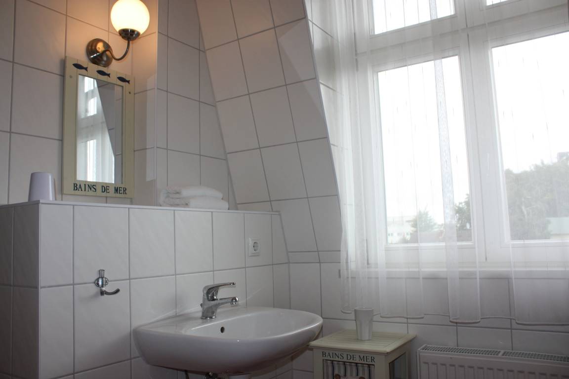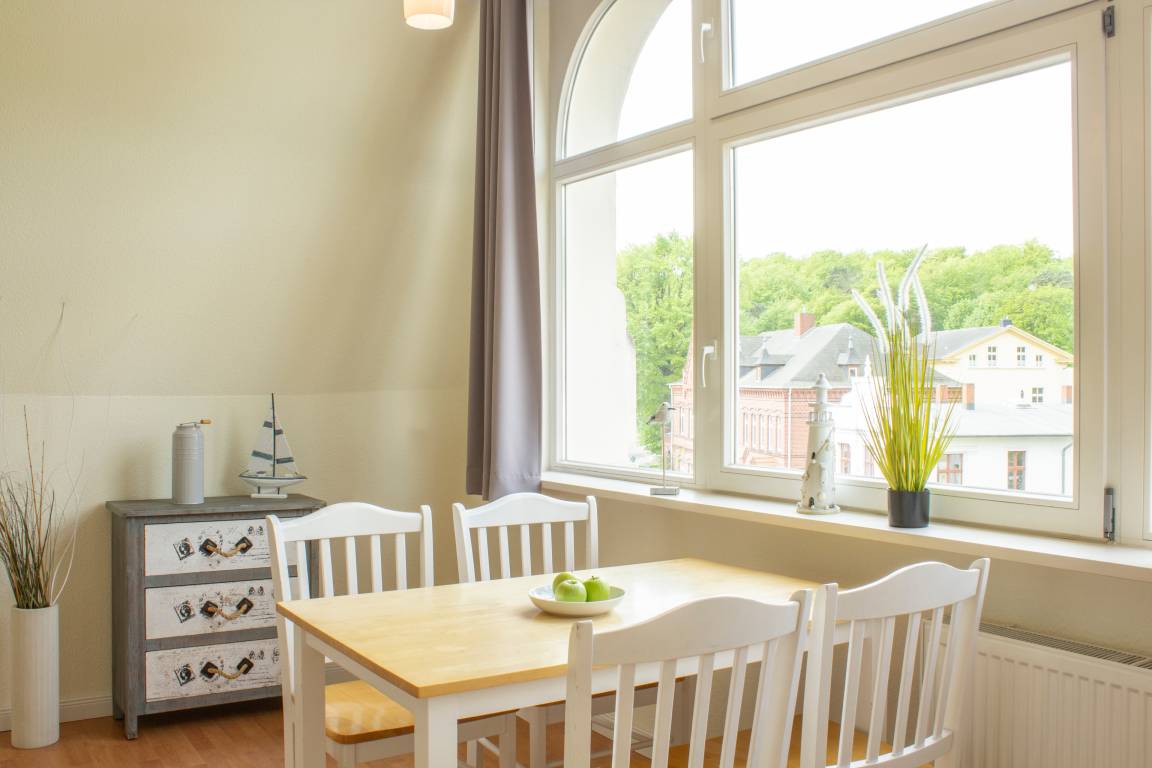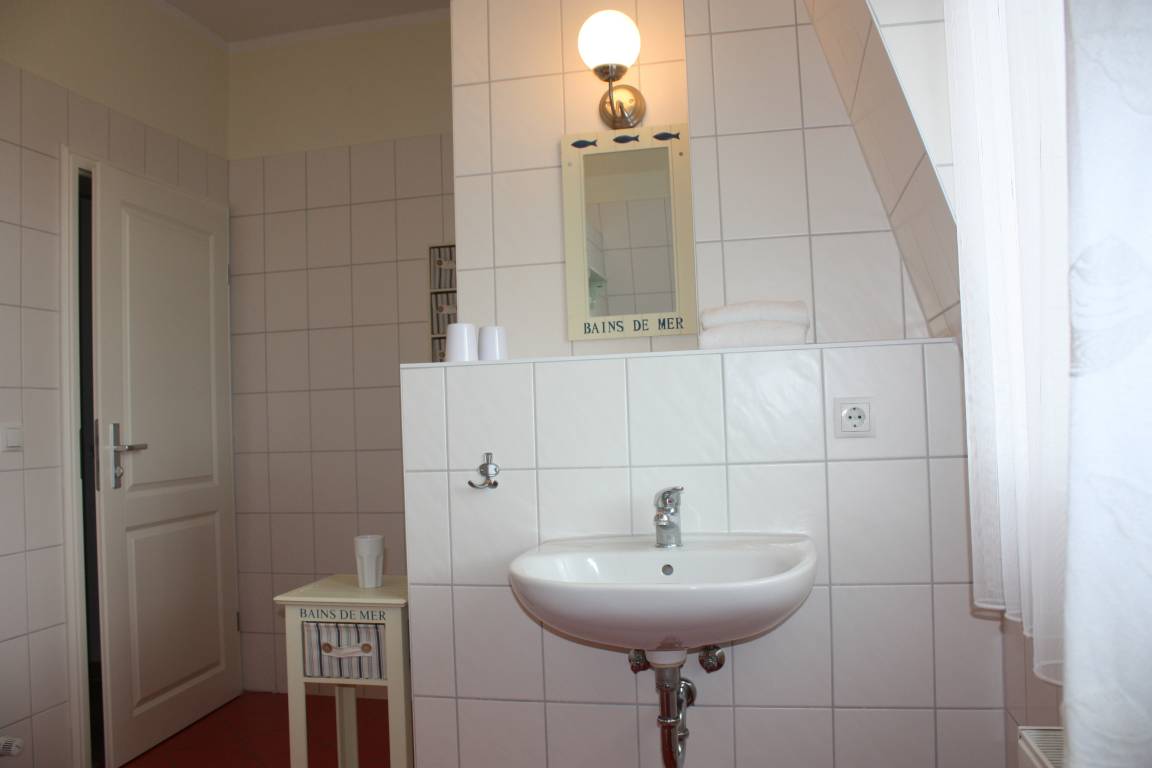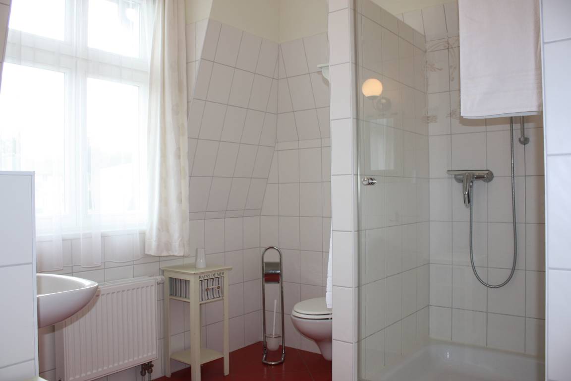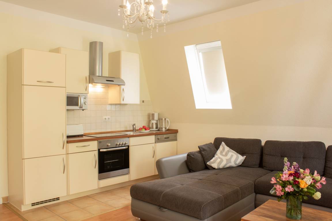 Dieses ca. 60 qm große 2-Zimmer-Appartement liegt im 2. Ober- bzw. Dachgeschoss und ist für 2-4 Personen geeignet. Im gemütlichen Wohnraum finden die Gäste eine Sitzgarnitur mit Flat-TV sowie die offene Vollküche inclusive Geschirrspüler, Cerankochfeld, Kühlschrank, Mikrowelle etc. An dem großen Esstisch in der geräumigen lichtdurchfluteten, geschlossenen Loggia (Fenster lassen sich öffnen), die zum Süden gerichtet ist, können die Mahlzeiten eingenommen werden. Das Schlafzimmer ist mit einem Doppelbett mit getrennten Matratzen (90 x 200) und reichlich Schrankraum ausgestattet. Im Badezimmer mit Fenster stehen Dusche, Waschbecken/WC zur Verfügung.