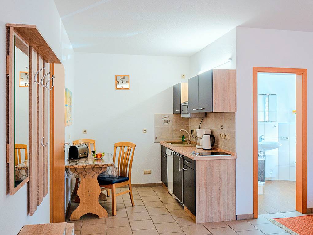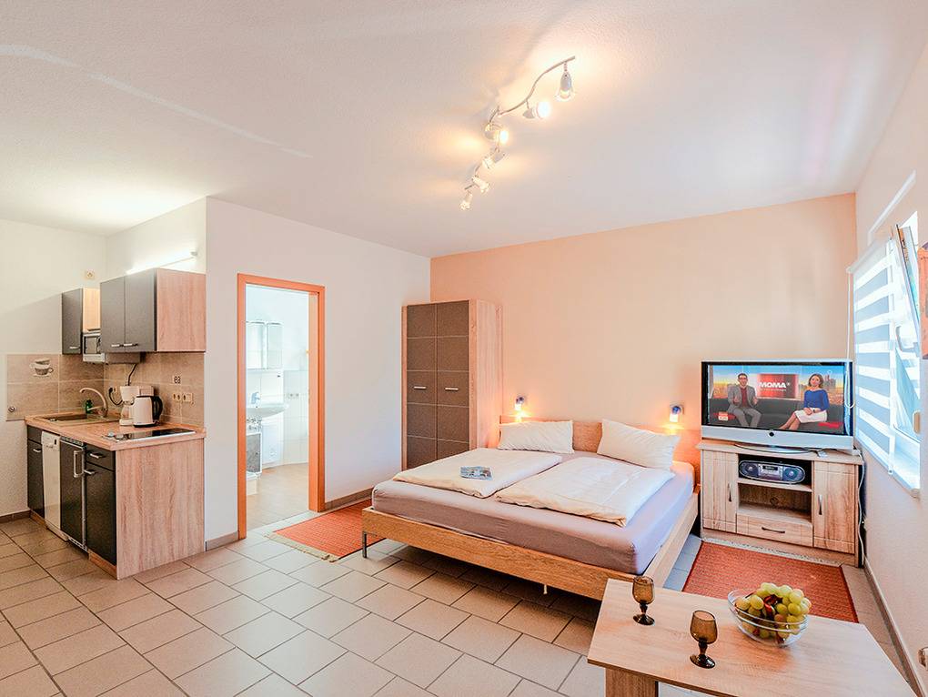 D 10.52 Wohnung 2 Pers.: Studio mit 30 qm Wohnfläche, Parterre. Wohn-/Schlafraum mit Doppelbett, Sofa-Sitzecke, Sat-TV, Esstisch, Küchenzeile (2 Pl. Ceranfeld, Spülmaschine). Bad/WC.