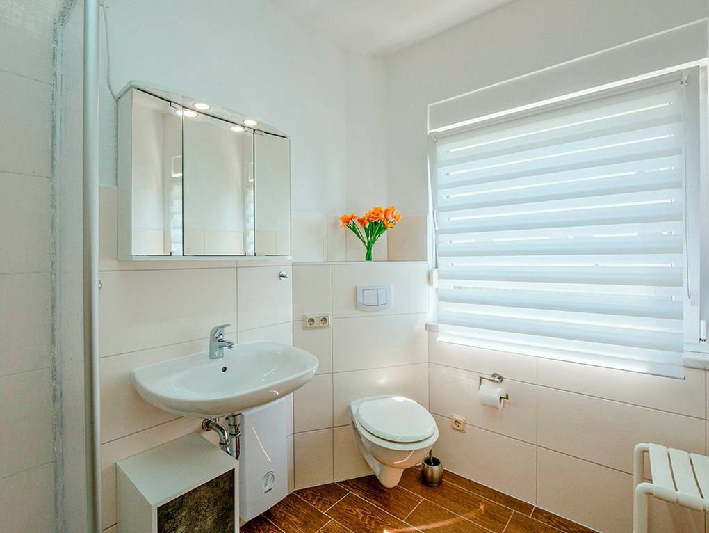 Haus: Gepflegtes Wohnhaus mit einer modern eingerichteten Wohnung. Kostenloser Internetzugang über W-Lan. Fußbodenheizung. Kleine Terrasse mit Sitzmöbeln vor dem Haus. 1 Pkw-Stellplatz.