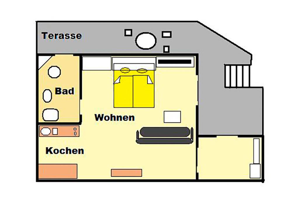Nebenkosten 5 €/Pers./Tag (werden bei Buchung erhoben). Endreinigung 60 €. Kurtaxe. Bettwäsche leihbar 10 €/Pers (Bestellung). Handtücher leihbar 5 €/Pers (Bestellung). Zusätzliche Leistungen 1 Pkw-Stellplatz im Preis inklusive. Kostenoser Internetzugang über WLAN. Kinder Babybett zusätzlich zur maximalen Personenzahl 2 €/Tag (Bestellung). Hochstuhl 1 €/Tag (Bestellung). Haustier nicht erlaubt.Räume & Aufteilung