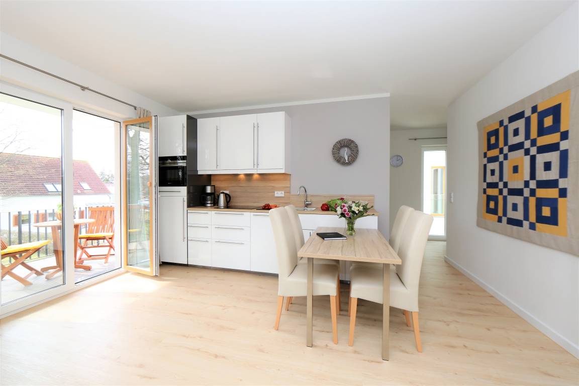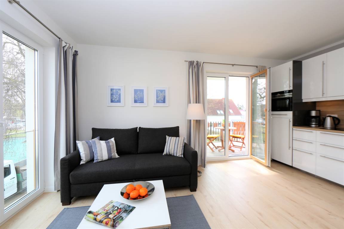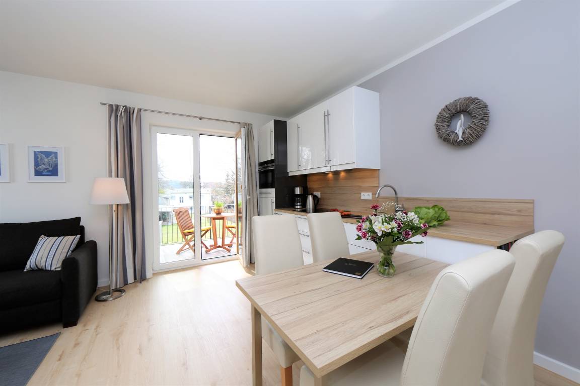 Das liebevoll und mit Geschmack eingerichtete 57 qm große Zwei-Zimmer-Appartement befindet sich in der 1.Etage der 2016 errichteten Anlage "Ahlbeck Suiten" , ca. 250 Meter vom Strand entfernt. Im modernen Wohnzimmer laden eine gemütliche Couch (mit Schlaffunktion) und Sessel mit Couchtisch zum Entspannen ein. Auf der gegenüberliegenden Flachstrecke sind die LED-TV, Radio/CD und Blu ray Player platziert. In den Wohnraum ist die Vollküche mit Backofen/Mikrowelle, Ceranfeld, Kühlschrank, Geschirrspüler, ... integriert. Direkt vom Wohnzimmer aus gelangt man zum möblierten, nach Süden ausgerichteten Balkon mit Blick in einen Garten. Im Schlafzimmer steht ein Boxspringbett (180x200) und ein geräumiger Schrank zur Verfügung. Das Badezimmer ist mit großem Waschtisch, einer Dusche und WC ausgestattet, ein Fenster sorgt für Helligkeit.