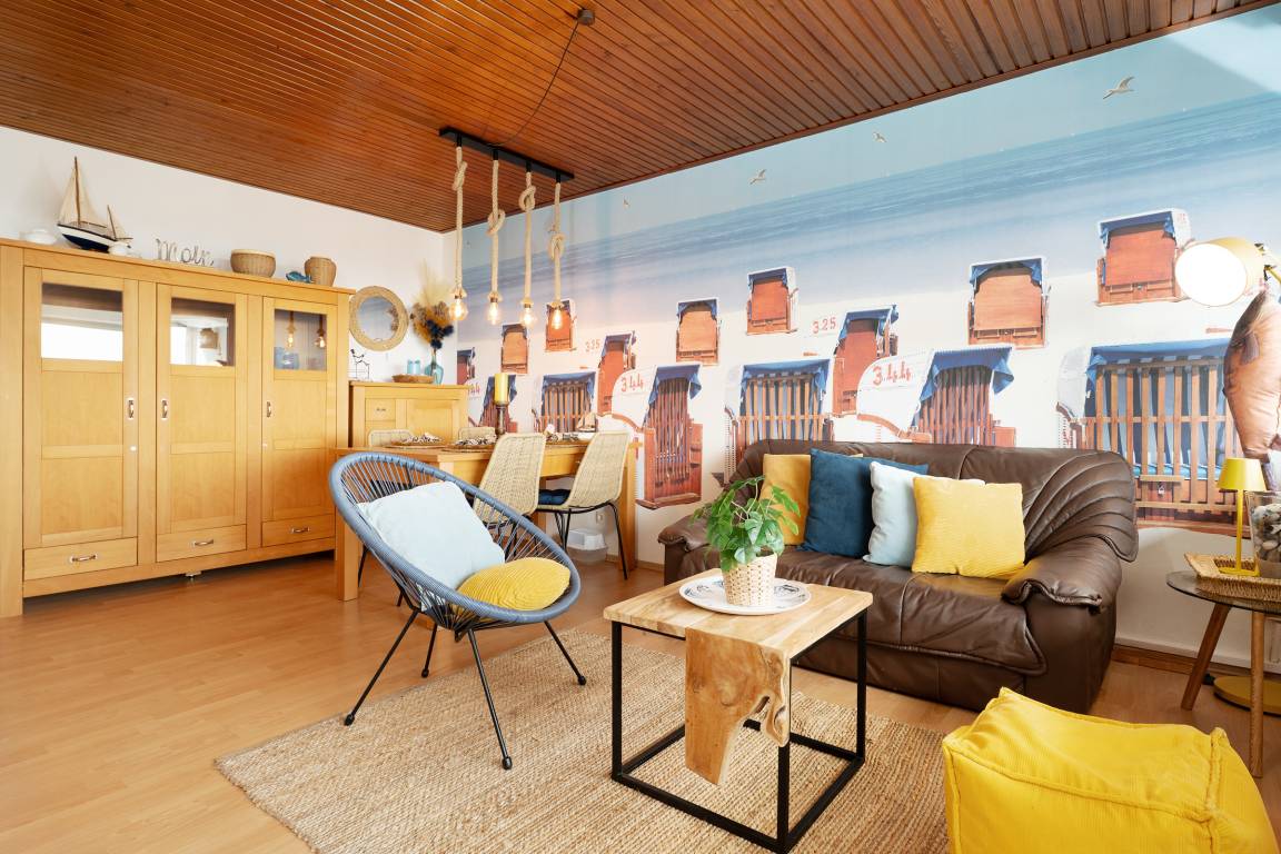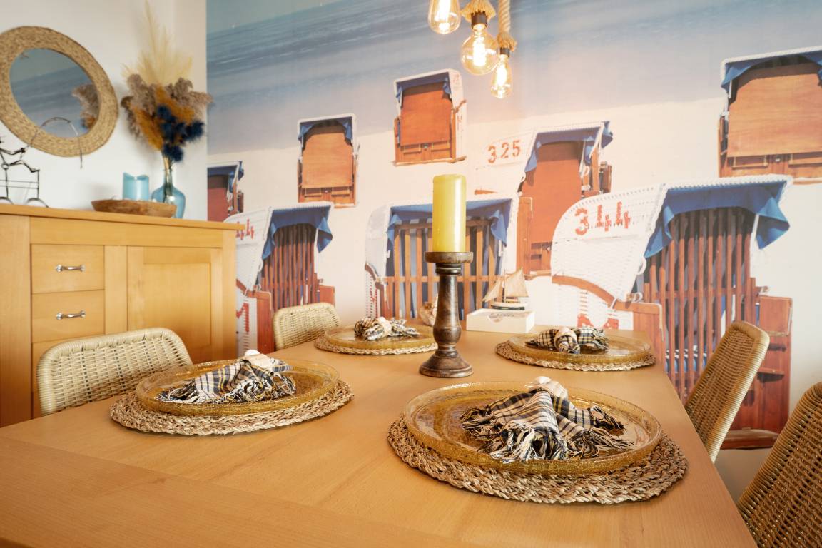 Der helle, modern gestaltete Wohnbereich mit dem gemütlichen Sofa, das bei Bedarf in einen Schlafplatz (140x180cm) für weitere 2 Personen verwandelt werden kann, lädt nach ausgiebigen Spaziergängen zum Entspannen ein. Für Unterhaltung sorgt der Flachbild-Fernseher, ein DVD- sowie ein CD-Player. Nur wenige Schritte trennen Sie vom möblierten Balkon, auf dem Sie wunderbar Ihren morgendlichen Kaffee mit Blick auf die Ostsee genießen können, sogar ein Grill ist vorhanden und lädt zu genussvollen Barbecue-Abenden ein.