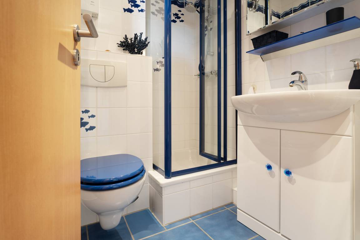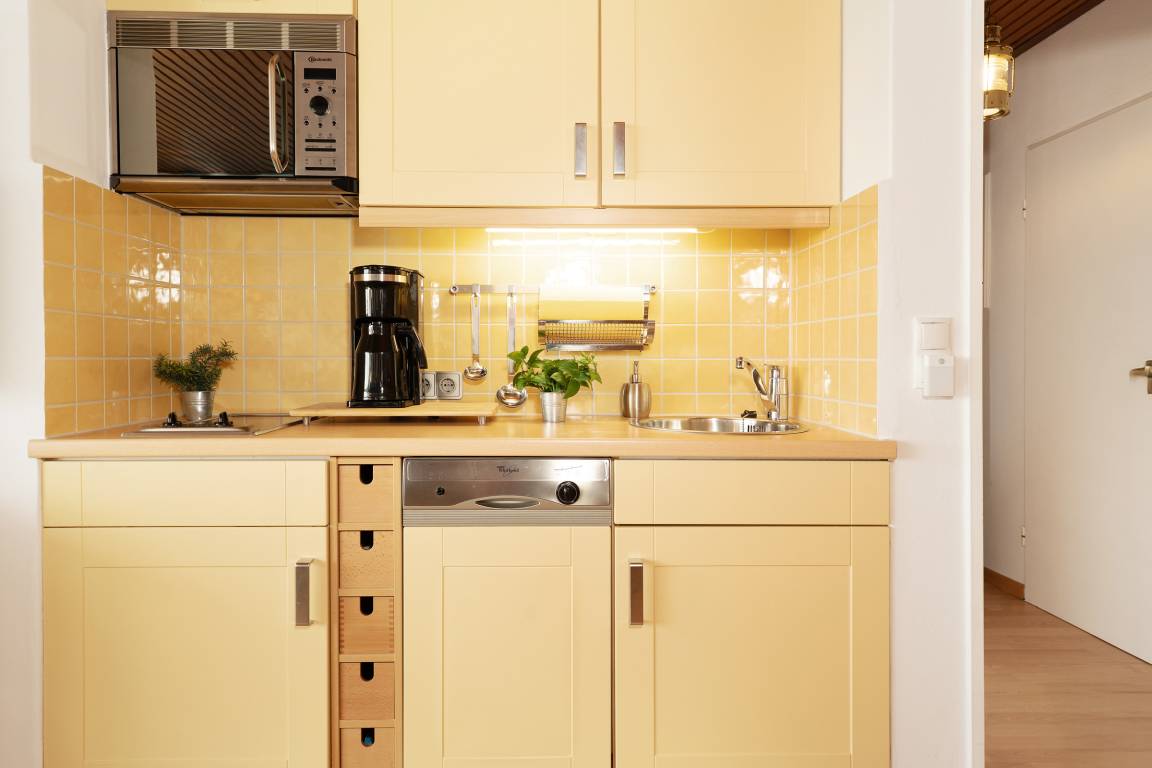 Die in den Wohnbereich integrierte Küche lässt keine Wünsche offen und ist mit allen Annehmlichkeiten ausgestattet, der angrenzende Esstisch bietet ausreichend Platz für alle Gäste. Geruhsame Nächte verbringen Sie im geschmackvoll eingerichteten Schlafzimmer im gemütlichen Doppelbett (160x200cm). Zur Nacht lassen sich beide Zimmer angenehm abdunkeln, Ihre Urlaubsgarderobe können Sie im Kleiderschrank perfekt verstauen. Das hell geflieste Badezimmer ist mit Dusche und WC funktional ausgestattet.