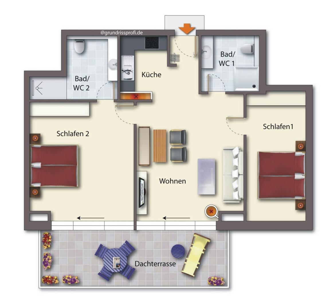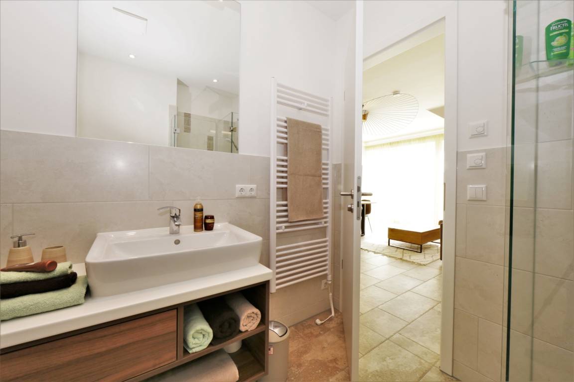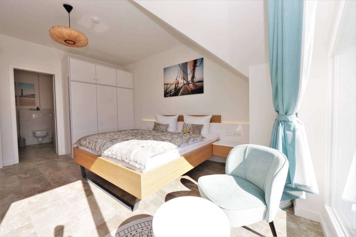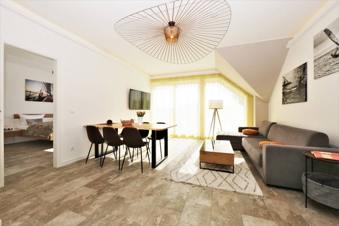 Dieses mit 77 qm großzügige 3-Zimmer Appartement befindet sich im Dachgeschoss der 2018 neu erbauten Strandresidenz und bietet 4 bis maximal 5 Personen reichlich Komfort. Genießen Sie Ihren Urlaub direkt am Meer in dieser hochwertig und sehr geschmackvoll eingerichteten Wohnung. Im Wohnbereich mit großer Fensterfront erwartet Sie eine bequeme Polstergarnitur bestehend aus Sofa (mit Schlaffunktion 140 x 190) und Sessel, ein Couchtisch und großer Flat TV sowie ein gemütlicher Esstisch für gemeinsame Mahlzeiten. Ein Gaskamin sorgt ebenso für Gemütlichkeit wie für zusätzliche Wärme bei Bedarf. Die moderne Küche mit Cerankochfeld, Backofen, Geschirrspüler, Kühlschrank etc. ist offen im hinteren Wohnbereich integriert. Beide Schlafzimmer verfügen jeweils über ein komfortables Doppelbett mit getrennten Matratzen (Topper 180 x 200), reichlich Schrankraum sowie einen zusätzlichen großen Flat TV. Über den Wohnbereich sowie eines der Schlafzimmer erreichen Sie den riesigen zum Osten ausgerichteten Balkon, der am Vormittag viele Sonnenstunden verspricht und Sie zum Frühstücken im Freien einlädt. Genießen Sie den Blick auf die Promenade und auf die Ostsee zwischen den Baumkronen hindurch. Die Glaseinfassung am Balkon schützt Sie vor möglichem Wind. Beide Badezimmer sind mit einer bodengleichen Dusche mit Echtglasabtrennung und Waschtisch/WC ausgestattet.
